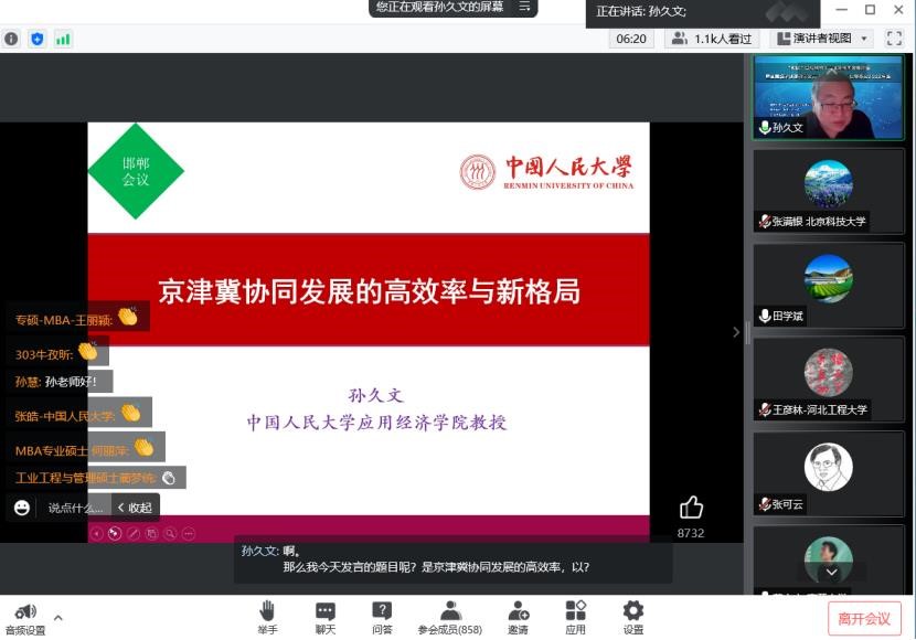 来自中国人民大学、中国社会科学院、南开大学、首都经济贸易大学、河北经贸大学、河北工程大学等国内知名专家、学者就“双碳”目标背景的京津冀协同发展趋势进行了深入研讨。本次论坛由全国经济地理研究会张满银秘书长、河北工程大学管理工程与商学院院长王彦林教授、全国经济地理研究会京津冀专委会主任张贵教授共同主持。共计1700多人通过线上方式参加论坛。