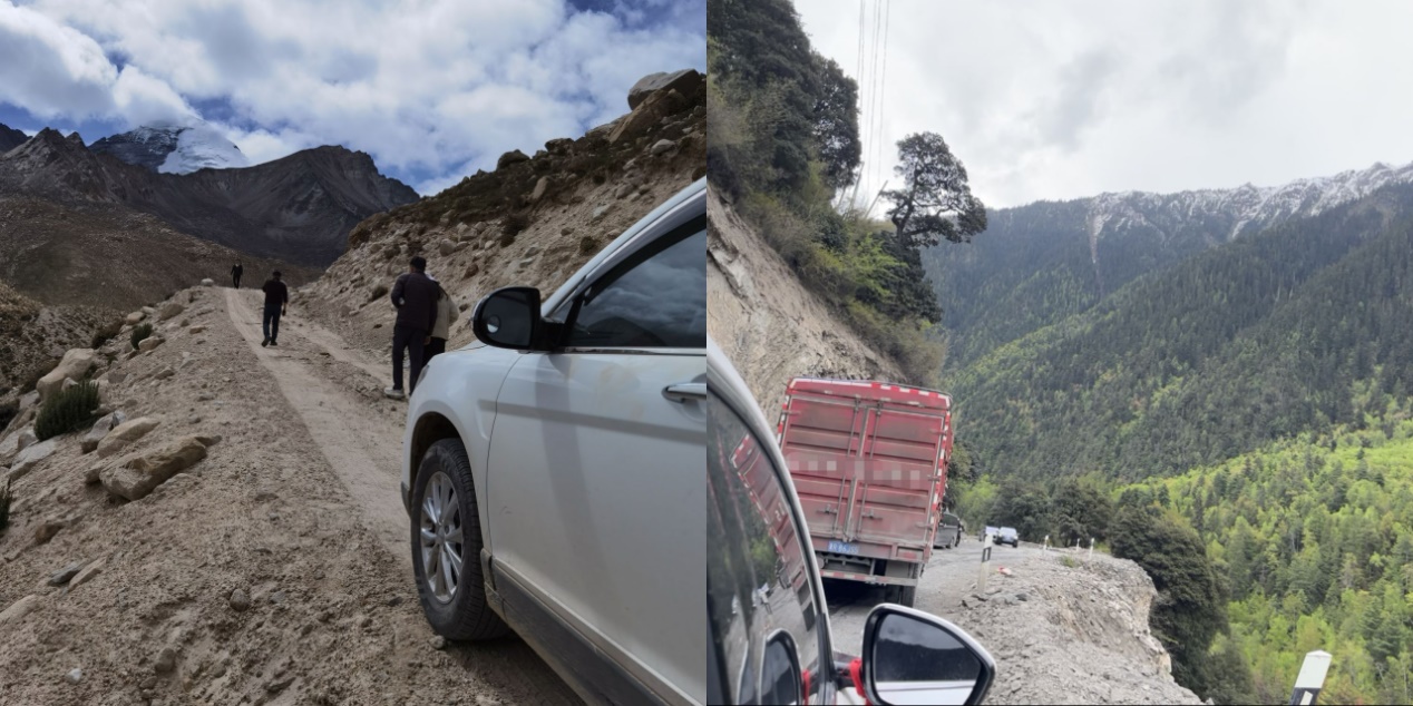 ▲“832工程”足迹之最——路途最险,左图在康马县海拔4926米中国与不丹边境的险峻山路,右图为从西藏林芝波密县前往察隅县途中,狭窄的砂石路面和两侧的悬崖峭壁