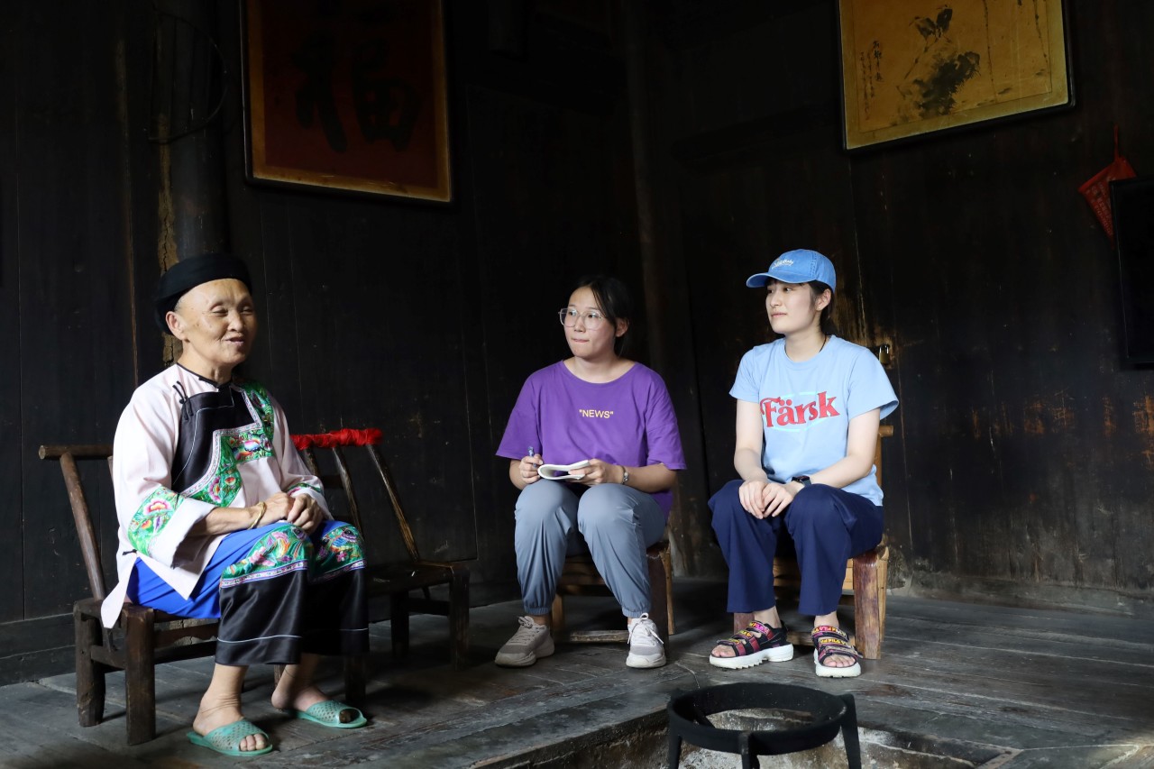 ▲在湖南湘西花垣县十八洞村,博士生宗一博和本科生林巧慧听石爬专老人讲述精准扶贫给老人生活带来的变化