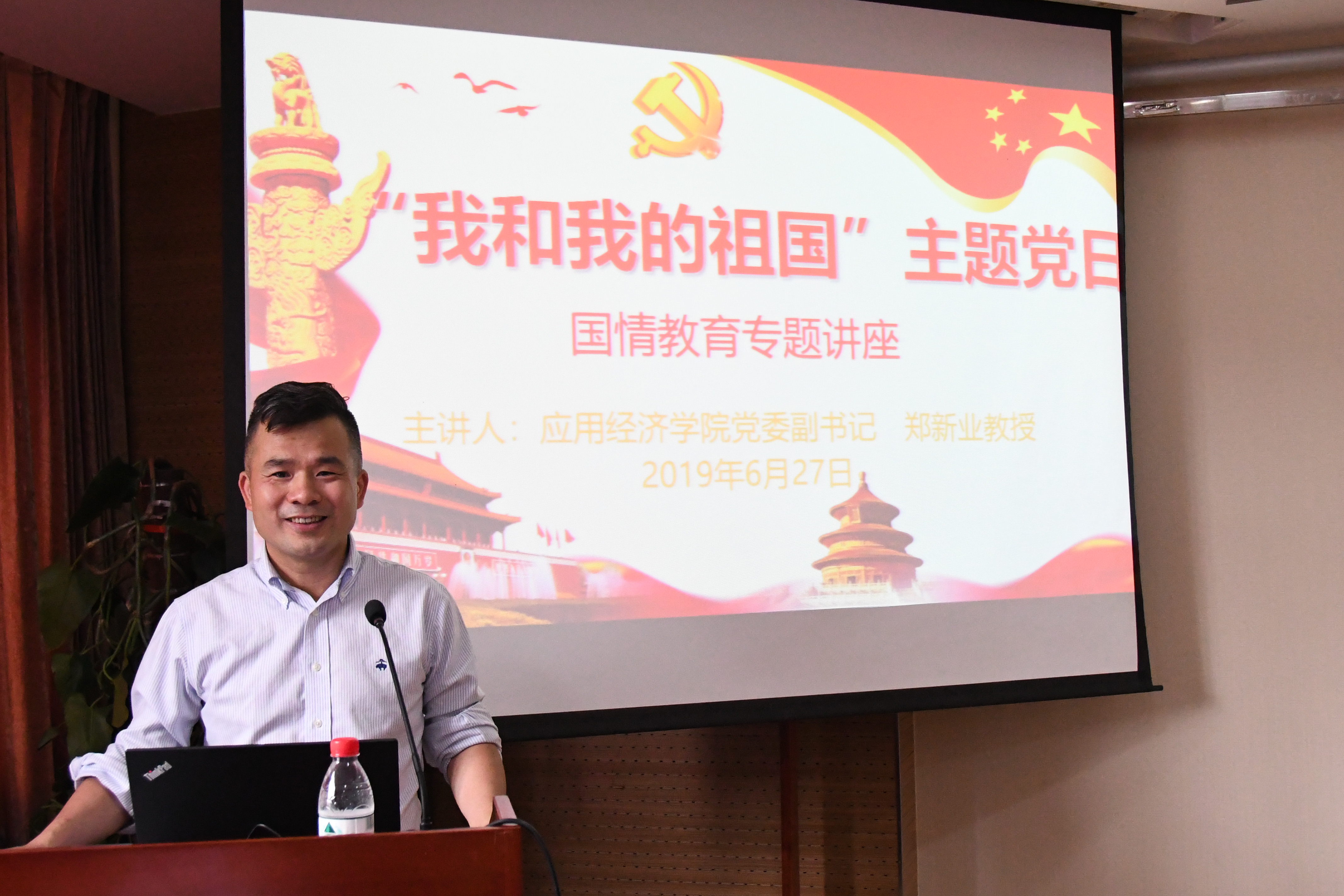 随后,郑新业院长围绕“我和我的祖国”主题进行了题为“坚持党的领导、坚持改革开放,建设新时代中国经济”的国情教育专题报告。结合时代背景和专业知识,分别从“改革开放四十年的巨大成就”、“中国经济的自画像”、“新时代经济中的潜力与挑战”、“党的大政方针是国家发展的强有力保证”四个部分进行了详细的解读。