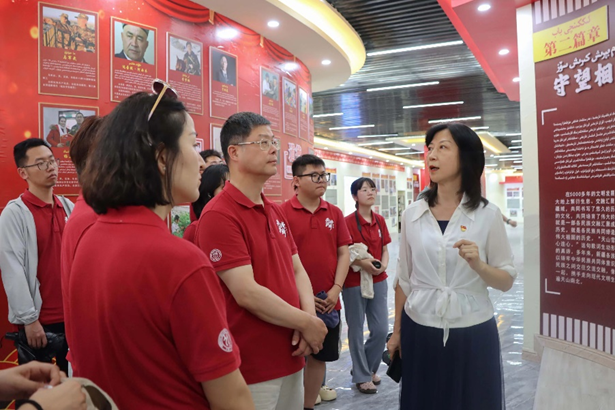 之后,调研团队前往库尔班民族团结大院和依麻木镇中华文化大院,学习了更多库尔班·尼亚孜的个人经历和他致力于民族团结的感人事迹。1986年,库尔班·尼亚孜从新疆大学汉语言专业毕业,之后几年沿海发达地区的闯荡经历让他认识到国语普及的重要性。2003年,他选择回到家乡,创办国通语学校。但是周围乡亲不理解他的用意,并恶意揣测他是为了升官发财。库尔班只好带着两个汉族老师挨家挨户做工作,并且允诺“学费一分钱都不用掏,两个星期如果教不好,还要退给你600元”,就这样终于招到了第一批87个学生。