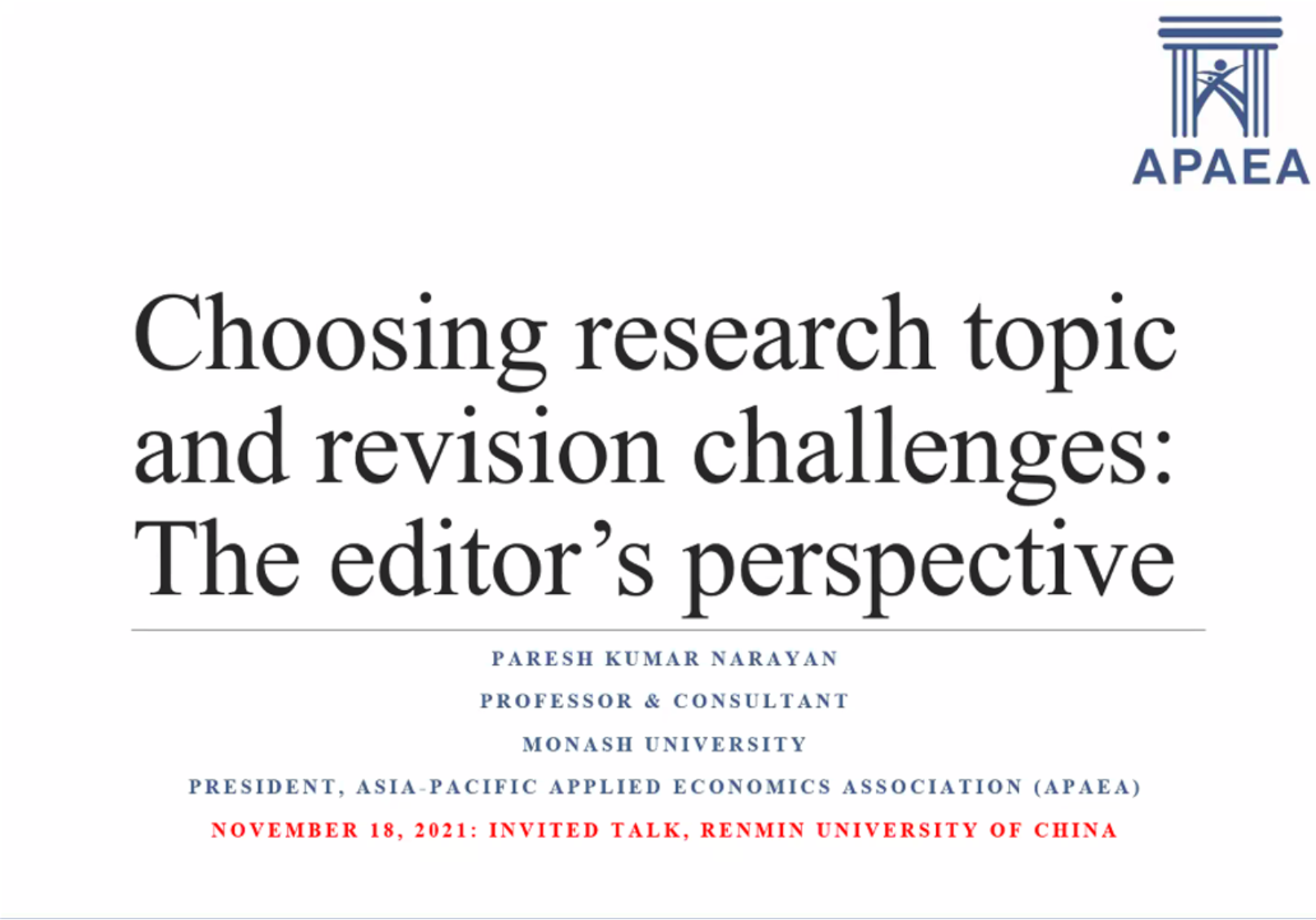 “2021与国际期刊主编‘面对面’学术讲座”系列学术讲座第七讲,主讲嘉宾为莫纳什大学商学院教授Paresh Kumar Narayan,讲座由英雄联盟下注 助理教授卢昂荻主持。Paresh Kumar Narayan结合自身经历与研究成果,以“Choosing Research Topic and Revision Challenges: The Editor’s Perspective”为题进行了本次的分享。Paresh Kumar Narayan教授从研究的目的、受众、认知、表达等角度分别介绍了如何选择研究的主题,并分享了自己总结的研究主题选择过程中的五个关键点,即避免做别人已经做过的,选择时下关注的,确保主题能够引起新颖的研究,确保主题能够引发引用,确保通过多次稳健性检验能够实现研究目的并且数据质量良好。接着,他分享了应该以怎样的心态和行为来应对拒稿、修改和重新提交等编辑决定,并讲解了应该如何开展修改计划。结语中,Paresh Kumar Narayan告诉师生,好的期刊文章发表是十分困难的,同时要记得拒稿也是学术生涯中的一部分。最后,Paresh Kumar Narayan通过介绍自己今年发表的几篇文章来对今天的讲座内容进行分析和总结。