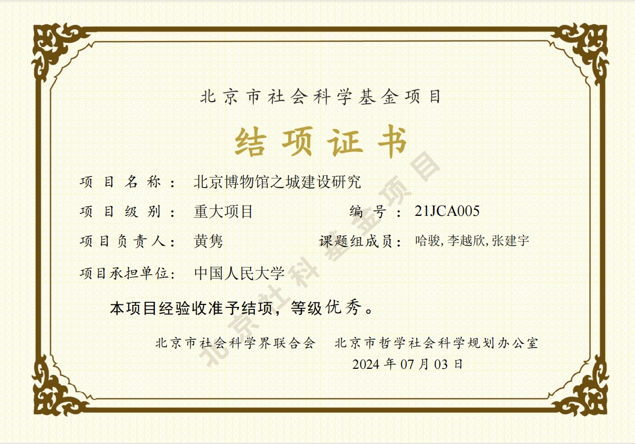 近日,英雄联盟下注-英雄联盟博彩 教授、文化经济研究所所长黄隽负责主持的北京市社会科学基金重大项目《北京博物馆之城建设研究》,经北京市社会科学界联合会、北京市哲学社会科学规划办公室评审专家验收准予结项,等级为优秀。