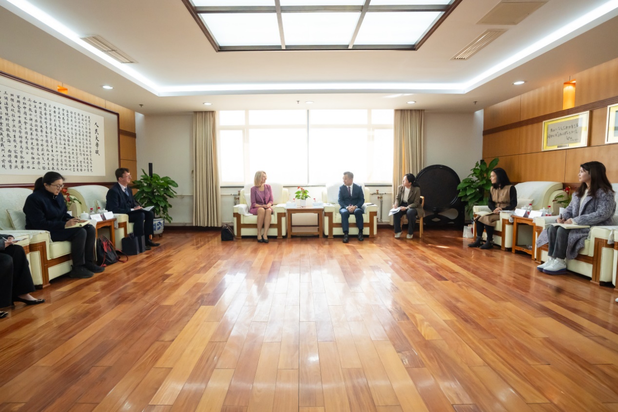 郑新业对比塔·贾沃西克一行来访表示欢迎,并简要介绍中国人民大学校史及学校概况。他表示,诞生于抗日战争烽火中的中国人民大学始终与党和国家同呼吸、共命运,早期培养的毕业生或是奔赴抗日前线,或是在抗日根据地投身土地改革、教育公平、妇女解放、医疗卫生事业,成为中国社会发展进步重要历程的早期实践者。作为“我国人文社会科学高等教育领域的一面旗帜”,中国人民大学积极与世界主要经济体开展教育交流合作,发挥哲学社会科学在融通中外文化、增进文明交流中的独特作用。欧洲复兴开发银行在中国拥有广泛影响和良好声誉,帮助和支持东欧、中欧国家向市场经济转化,对世界发展意义重大。学校希望能够充分整合能源经济系研究团队、和平与发展研究院等优势学术资源,与欧洲复兴开发银行在能源转型等领域进一步探索学术互访、联合研究、学术研讨等形式交流合作,携手推进中欧能源低碳转型合作,为实现绿色发展作出应有贡献。