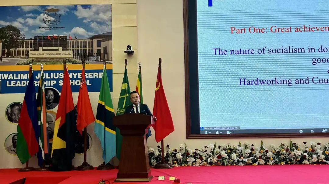 ▲在坦桑尼亚,“832工程”团队郑新业教授为尼雷尔领导力学院2023年南部非洲六姊妹党中青年干部研修班讲授中国减贫经验