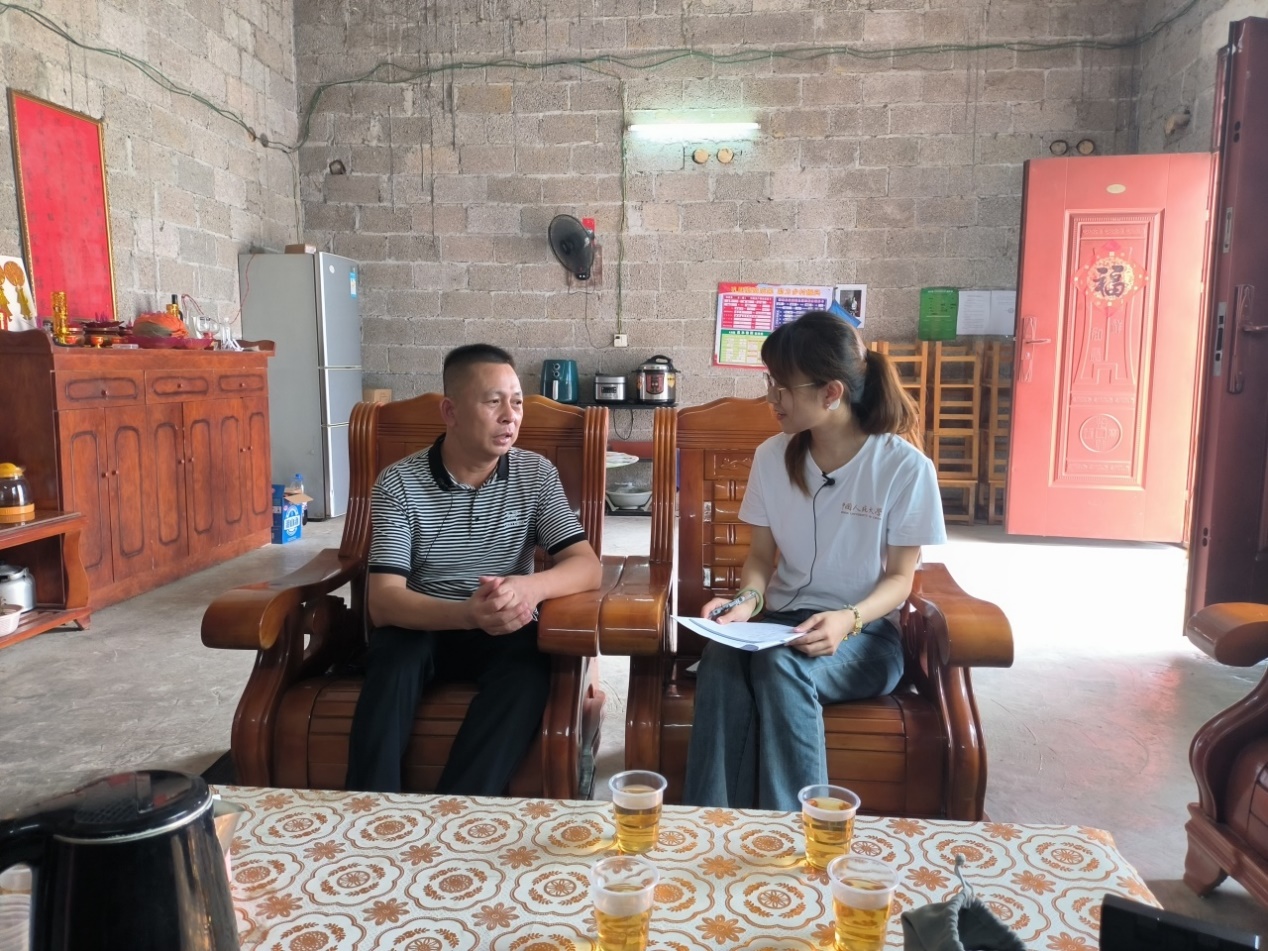 ▲硕士生石智彤入户访谈脱贫户韦永义