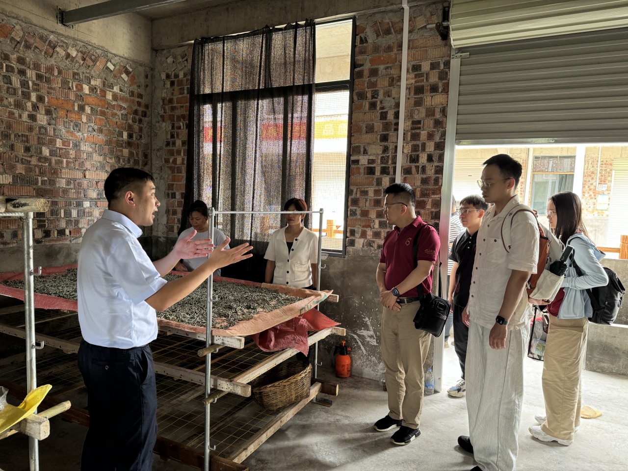 ▲大蚕房项目负责人向调研团介绍蚕房运作方式