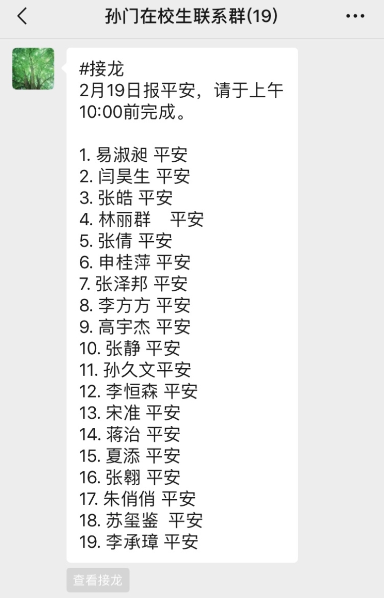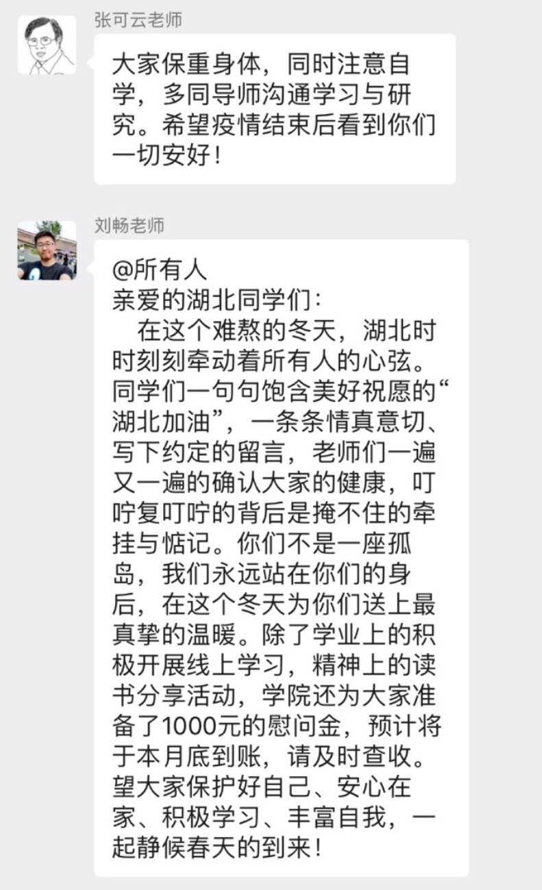 面对来势汹涌的肺炎疫情,学院在第一时间深入了解同学们春节返乡的具体路线,实时掌握途径湖北或武汉同学的身体情况。在学院院长郑新业老师的倡议下,在鄂学生微信群也建立了起来,各位老师在微信群里表达了对同学们的真切关怀,贴心地为群内每一位同学提供补助。党委书记宋东霞老师还亲自给身在湖北的同学发来暖心短信,让我深刻感受到人大老师们在疫情面前的责任与担当。