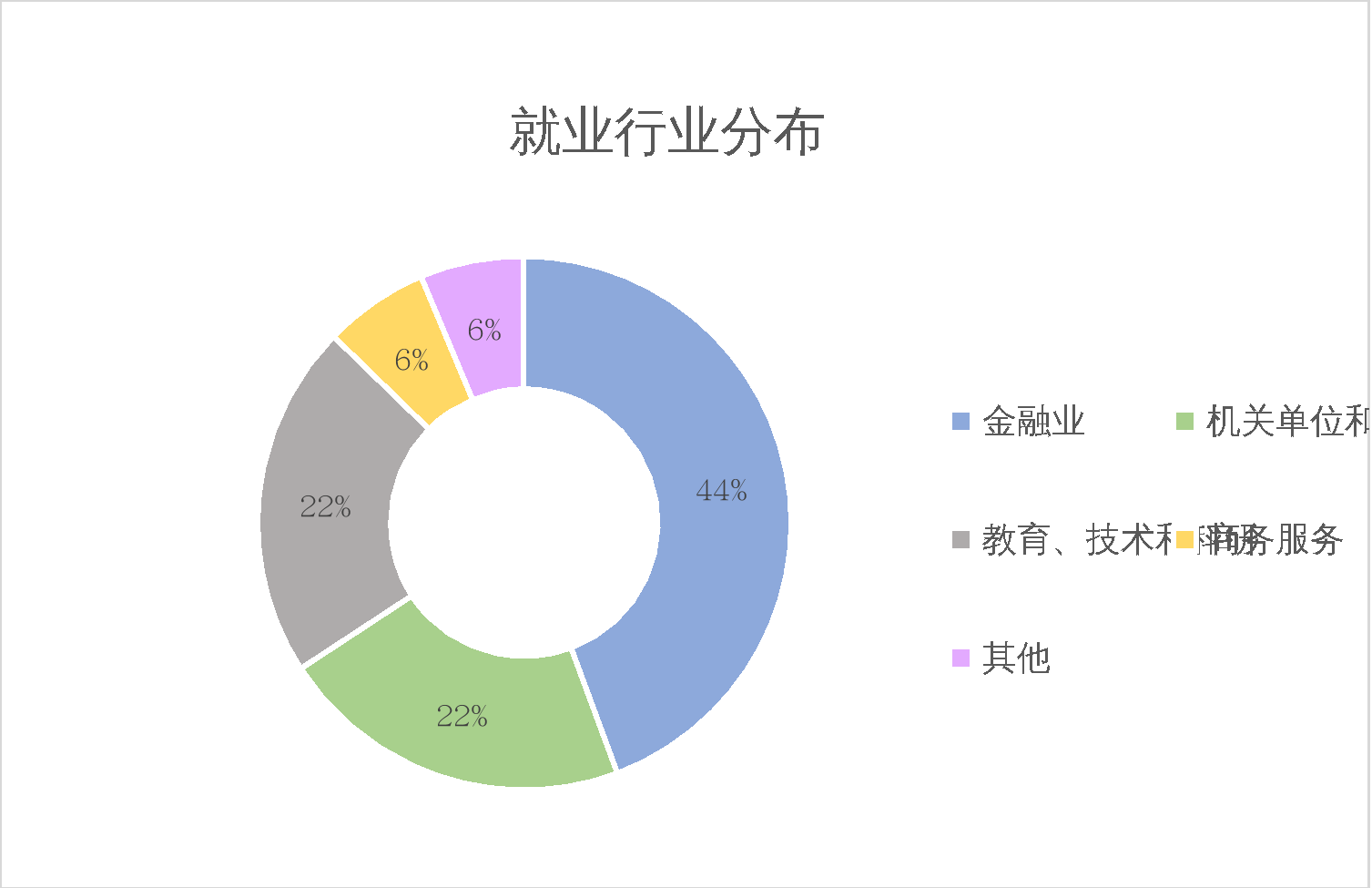 在就业行业分布上,学院2021届就业总人数中44%选择金融业,选择机关单位和社会组织与教育、技术和科研的人数相同,均占总人数的22%,选择商务服务和其他行业的人数相同,均占总人数的6%