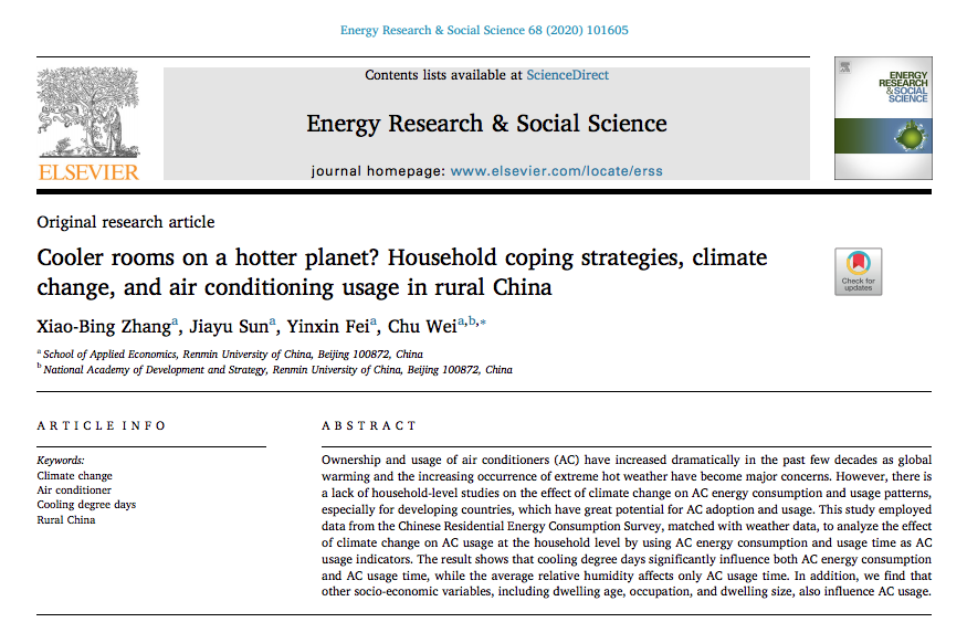 该研究的选题思路来自于,伴随全球变暖和极端天气的出现,其重要的适应性行为——空调的使用正得到越来越多的关注,但是相关的实证研究却很少,这一现象在发展中国家尤其突出。文章的主要贡献在于利用人民大学能源经济系的《家庭能源调查》的这一微观数据,弥补已有文献对该领域家庭层面研究的不足;在计量上,利用OLS与Ordered probit模型,研究了CDD与夏季平均相对湿度对空调制冷能耗、日均使用时长与年均使用时长的影响。(文章可通过此链接下载//authors.elsevier.com/a/1b5iE7tZ6Zqx-m)
