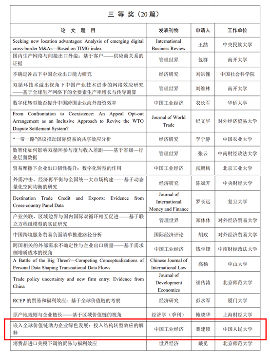 近日,第二十三届 “安子介国际贸易研究奖” 评奖结果公布。英雄联盟下注 教授裴建锁、博士生方勇彪(通讯作者)与北京工商大学讲师姜佳彤发表于《中国工业经济》2024年第2期的论文《嵌入全球价值链助力企业绿色发展:投入结构转型效应的解释》荣获“优秀论文奖”三等奖。