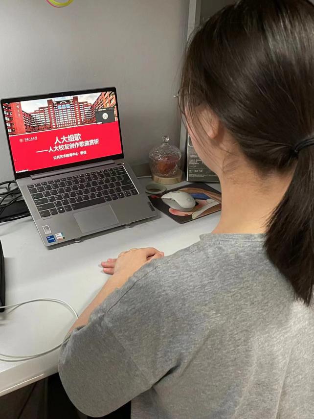费佳老师沿着中国人民大学的历史发展沿革娓娓道来,先后带领同学们鉴赏了《没有共产党就没有新中国》《东方红》《社会主义好》《西江月·井冈山》《五月的鲜花》《陕北公学校歌》等经典歌曲,温婉的语调饱含深情,歌曲背后的历史故事引人入胜,同学们都沉浸其中。在讲解《陕北公学校歌》时,同学们一起打开麦克风,共同合唱了这首由吕骥老师在85年前谱写出的满溢精神力量的校歌。一个人的声音虽小,但大家的精神和激情凝聚在一起,汇聚的力量气势磅礴。正是这种青春力量推动着一代又一代“人大人”不断前进,展现出中国人民大学“党办的大学让党放心,人民的大学不负人民”的精神品格。