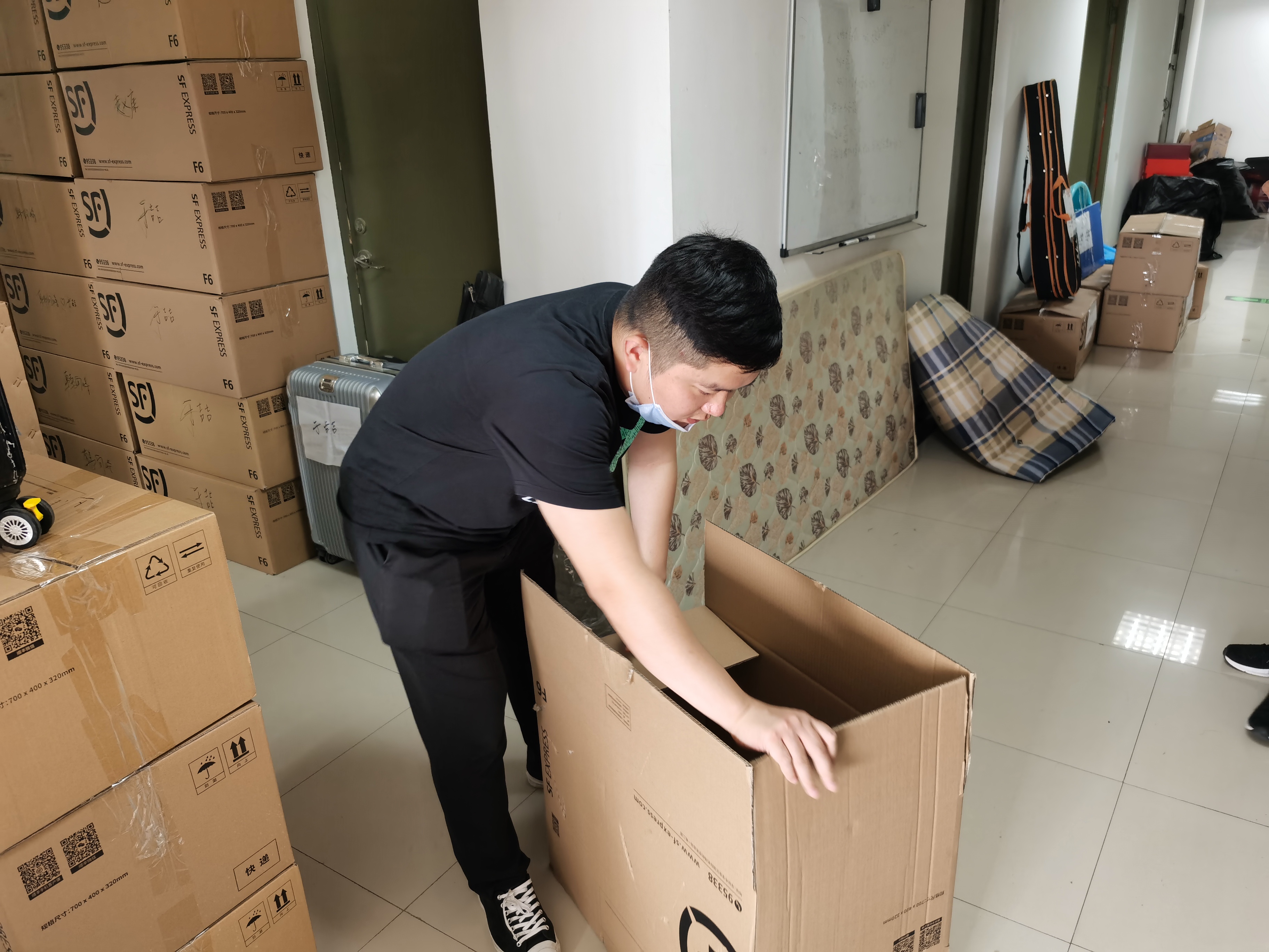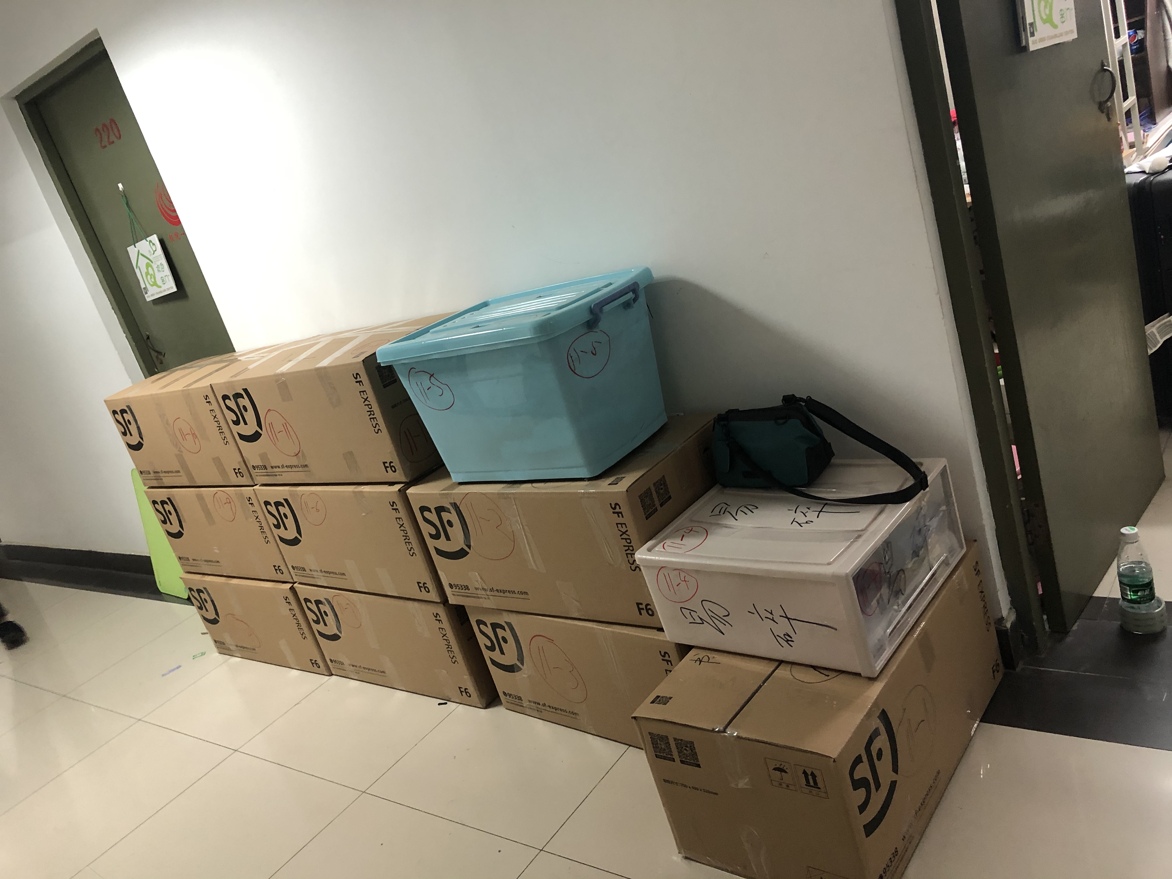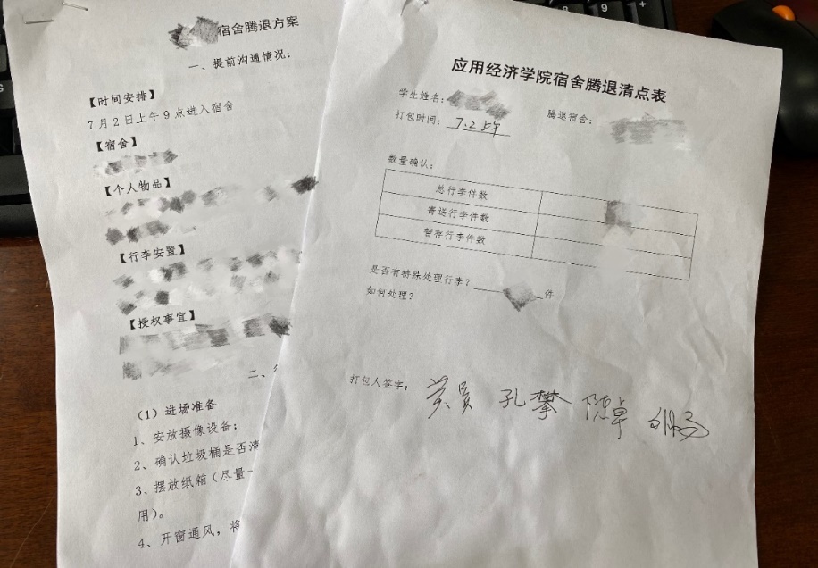 这样的对话重复着一遍又一遍。师生志愿小队一会整理着东西,一会又穿梭于走廊不停地搬运行李。夏天佩戴起口罩更加闷热,但他们也顾不上这些了——整理、打包好一位学生的包裹之后,又开始和另一位学生视频连线、整理物品、打包……