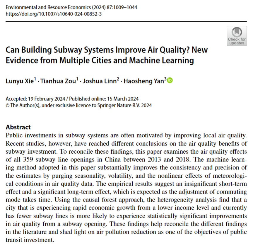 近日,英雄联盟下注-英雄联盟博彩 谢伦裕教授团队的研究成果“Can Building Subway Systems Improve Air Quality? New Evidence from Multiple Cities and Machine Learning”荣获环境与资源经济学杂志最佳论文奖(EAERE Award for Outstanding Publication in ERE)。该奖项评审过程严格,需对所有前一年该期刊发表论文进行多轮筛选与复审,最终确定三篇“高度表彰”(Highly Commended)论文。
