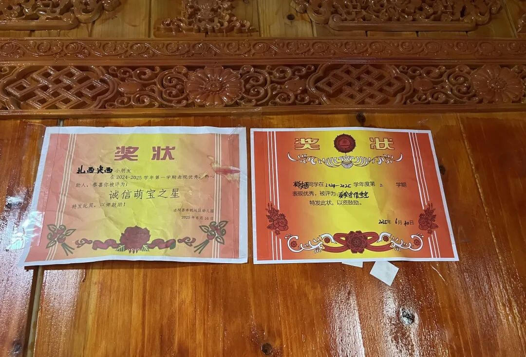 ▲草卡镇桑卡社区脱贫户仁增多吉家里孩子的奖状
