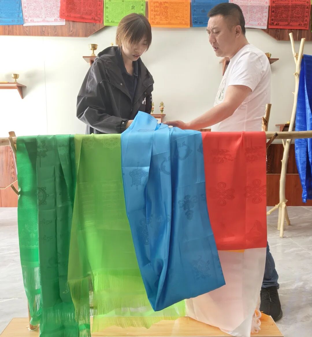 ▲三色圣洁哈达厂生产的哈达样品