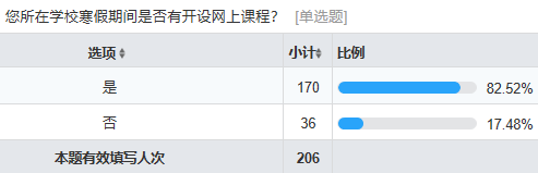 在各位同学居家隔离的同时,学校也秉持着“停课不停学”的原则开设了网上课程,参与调查的同学当中82.5%的同学表示学校已经开设网课,其中47%的同学所在学校已经开始了正式课程的指导,大多数同学对于网上课程的形式和内容也比较满意。总的说来,同学们虽然身在家中,但学习的步伐是在不断向前的。