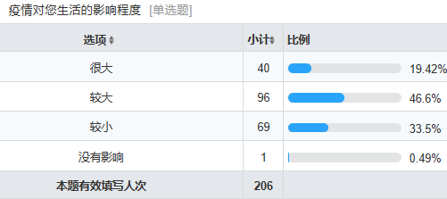肆虐的疫情还没有停息,每个人都在为抗击疫情贡献力量:众多的医务人员奋战在武汉前线,即使是我所在的小城市也已经有三批医护人员前往武汉支援;政府也积极采取防疫措施,为我们的生活提供帮助;居委会和社区也进行了管制以保护居民的安全;学校和学院也时刻关注我们的健康,班主任、导师每天多次确认位置信息、身体状况和面临的困难。全国人民都在以自己的方式抗击这次疫情,被宅在家的我们,能为抗疫做些什么呢?我们毛概课堂小组的成员一拍即合,大家决定在线做一个小调查,了解同学们的生活状况,受影响的情况和学习情况。说干就干,我们设计了一个包含14个题项的简单问卷,发动了小组内成员的高中同学、大学同学,以滚雪球的方式获得了206份有效填写的问卷,希望能够在疫情中做出自己的贡献。