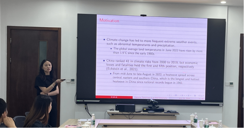 吴施美作题为“Dynamic Impacts of Extreme Temperature Shocks on Macroeconomic Activities: Aggregate and Province-level Evidence from China”的报告,指出极端气温是宏观经济活动的重要影响因素,极端气温通过提高生产成本影响供给侧,并在中长期通过减少消费和投资影响需求侧。