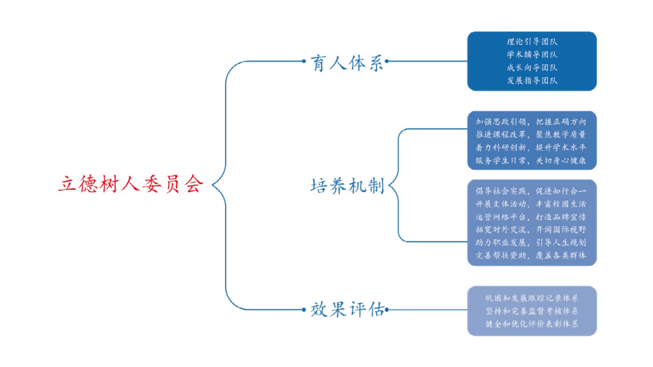 学院落实立德树人根本任务,设立“立德树人”委员会,完善“立德树人、铸魂育人”学生成长成才计划,统筹学院、教师、校友、家长等各方面力量,落实全员育人、全过程育人、全方位育人,建立“五育并举”协同育人新机制,提升人才自主培养质量,促进学生德智体美劳全面发展。