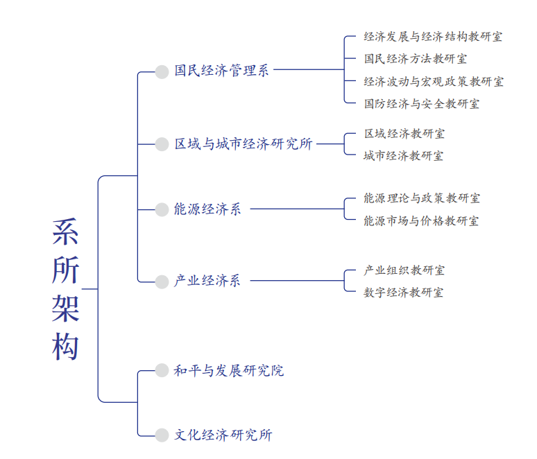 学院下设国民经济管理系、区域与城市经济研究所、能源经济系和产业经济系4个系所,和平与发展研究院和文化经济研究所2个研究机构。