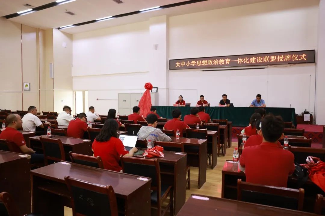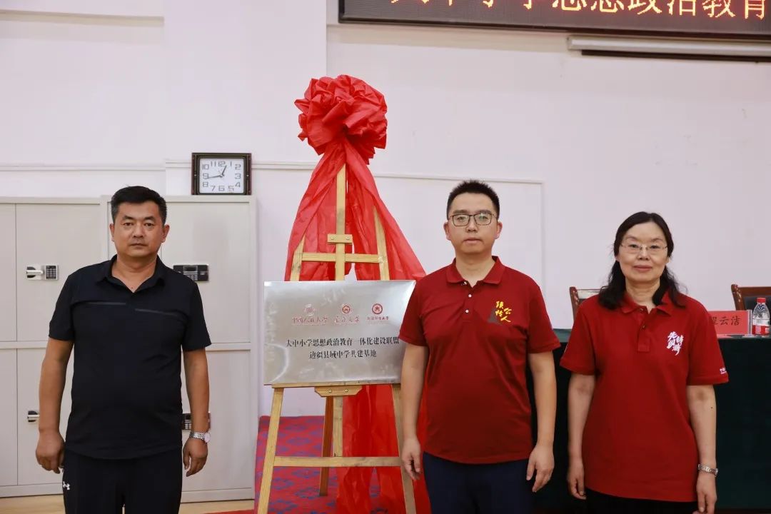 在和田县北京高级中学,调研团与教育局主要领导、学校主要领导举行了“中国人民大学-边疆县域中学”大中小学思想政治教育一体化建设联盟授牌仪式。