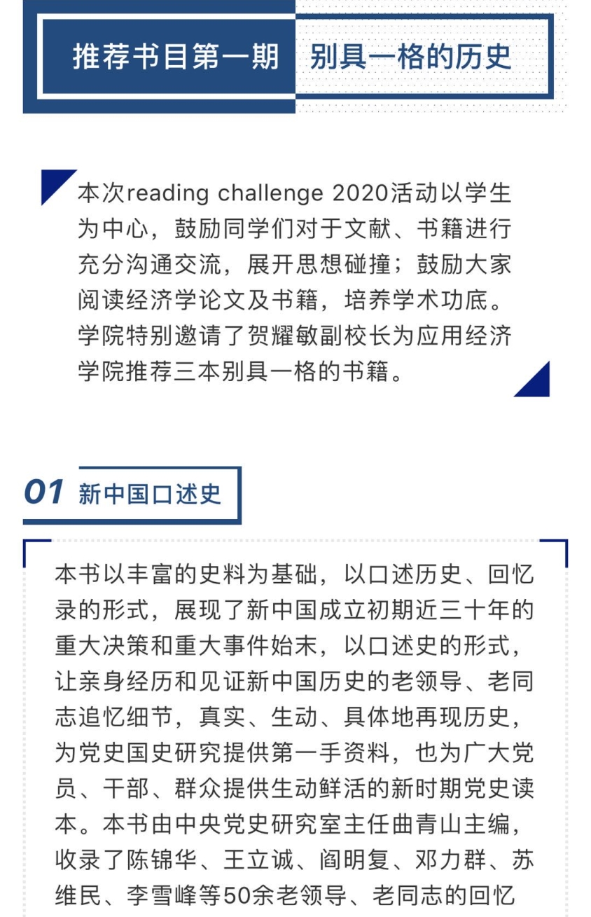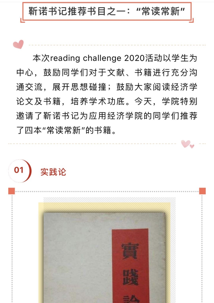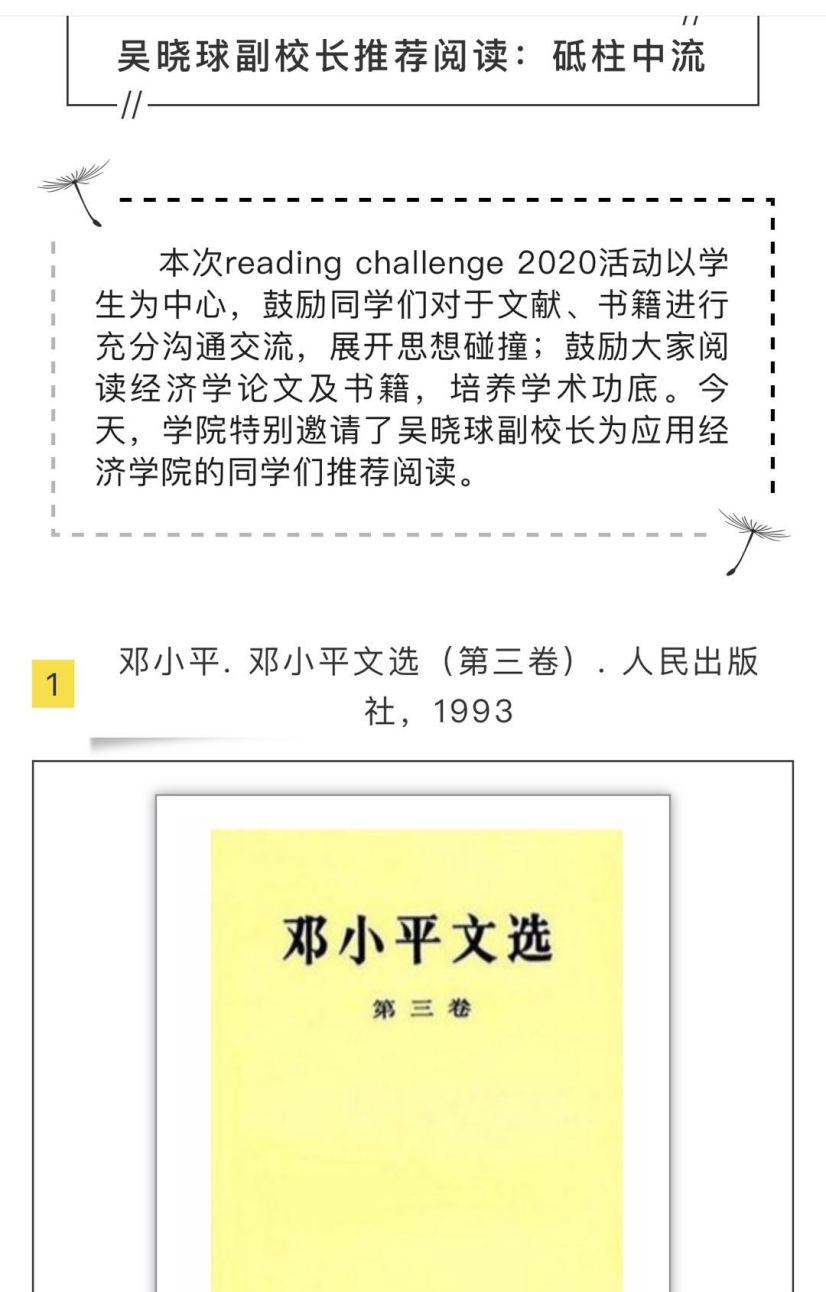 为进一步落实“三全育人”体制机制,做好疫情期间的人才培养工作,培养适应新时代要求的应用经济学“三有”人才,鼓励同学们在疫情期间阅读经典文献、追踪前沿研究,学院党委积极与多位学校领导请示,邀请靳诺书记、刘伟校长、贺耀敏副校长、吴晓球副校长和学院教师一起,为英雄联盟下注 的同学们推荐“主流、经典、前沿”书籍,鼓励同学们在阅读中增长知识,在阅读中扩大视野。