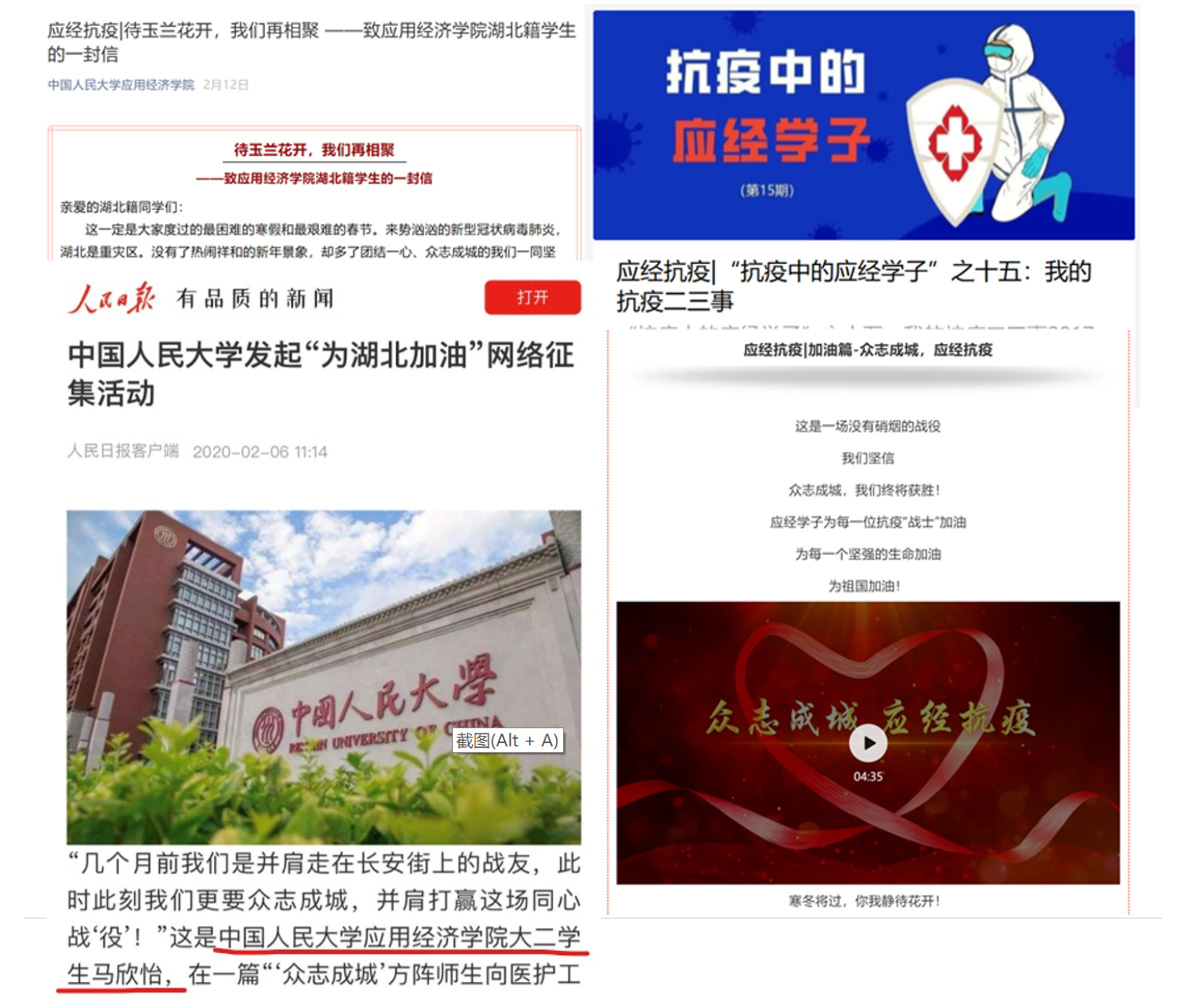 学院通过微信公众号、网站、微信等不同平台,采用文章、视频、互动活动等不同方式,及时传递防疫信息,传播疫情中的正能量,努力营造团结和谐、稳定有序的学院氛围。截止目前,学院公众号共发布疫情相关推送40余篇:为树立典型、弘扬正能量,推出“抗疫中的应经学子”系列报道18期,其中志愿者吴悠、单雅婷事迹被学工部公众号采用报道,系列报道宣传得到了学校的充分认可;2018级本科生马欣怡作为“众志成城人大人,共战疫情心连心”倡议活动发起人之一,被人民日报报道,我院随之推出的人物采访报道被校报采用,此外马欣怡撰写的抗击疫情故事也被校团委公众号采纳报道;为培养学生社会责任感,鼓励学生利用专业知识研究疫情防控与治理,学院积极开展主题学术论文征文活动;发起为武汉、湖北加油活动,制作“众志成城,应经抗疫”加油视频、给湖北同学留言传递温暖。