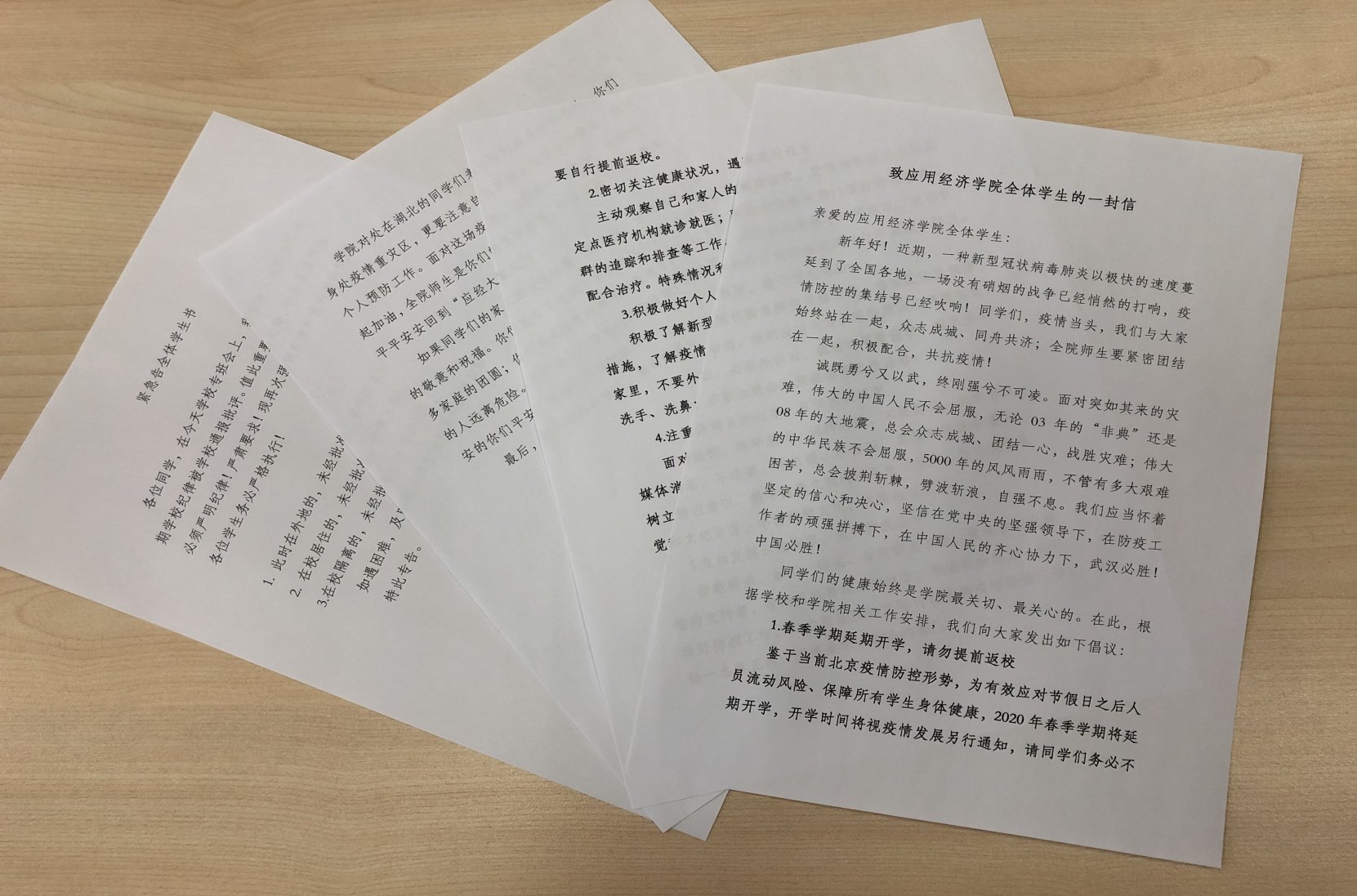 学院领导时刻关心着全院学生,及时掌握学生思想动态、关爱学生身心健康;通过班主任、导师等多渠道摸排了解学生面临的困难和需求,尽力帮助学生渡过难关;学院专门针对全体学生、班主任、身在湖北的同学等不同人群发布三封公开信,关心同学健康,宣传预防倡议。