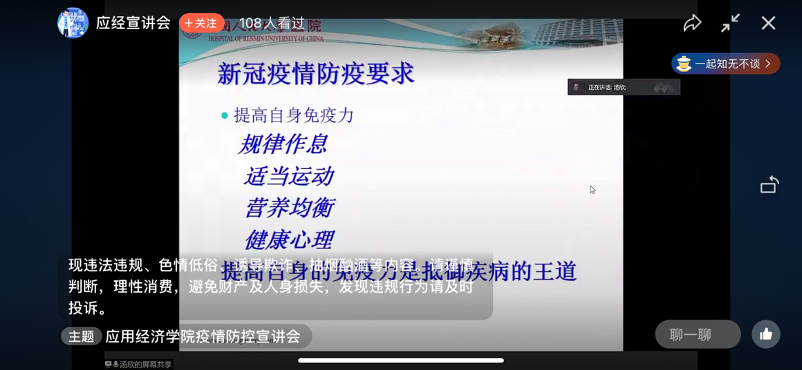 为深入贯彻落实学校疫情防控工作要求和“四个一”工作精神,进一步提升学院师生的疫情防控意识、增强科学防控知识储备,切实保障大家的健康和安全,5月18日,英雄联盟下注 邀请校医院副院长汤欣为全院师生作“新冠疫情形势及防疫要求”主题宣讲。宣讲会采用腾讯会议+微信直播的形式线上开展。
