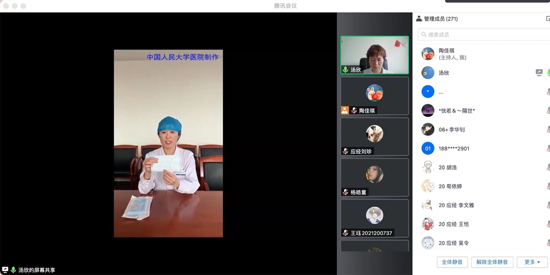接着,汤欣院长向同学们分享了科学防疫的注意要点,她强调了个人防护的12字口诀 :“戴口罩、勤洗手、多通风、少聚集”,并播放了正确佩戴口罩及七步洗手法教学视频。除了外部防护措施之外,她还强调了自身免疫力是疫情防控的关键一环,她建议师生应规律作息、适当运动、营养均衡,通过正确的方式排遣压力,保持健康心理。在切断传播途径方面,汤欣院长强调,大家要充分认识到信息及时上报的必要性,提高防控意识、大局意识,在自身面临风险时及时上报、杜绝病毒传播。