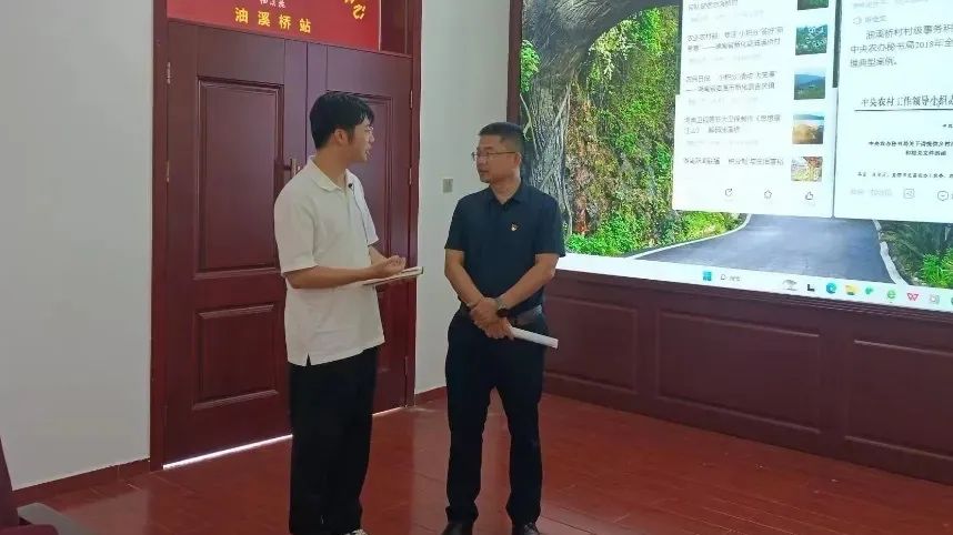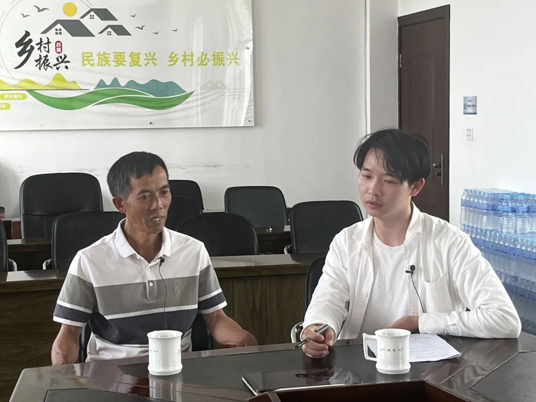▲在湖南省新化县,湖南大学博士生谢岳峰访谈访谈吉庆镇油溪村党支部书记彭育晚