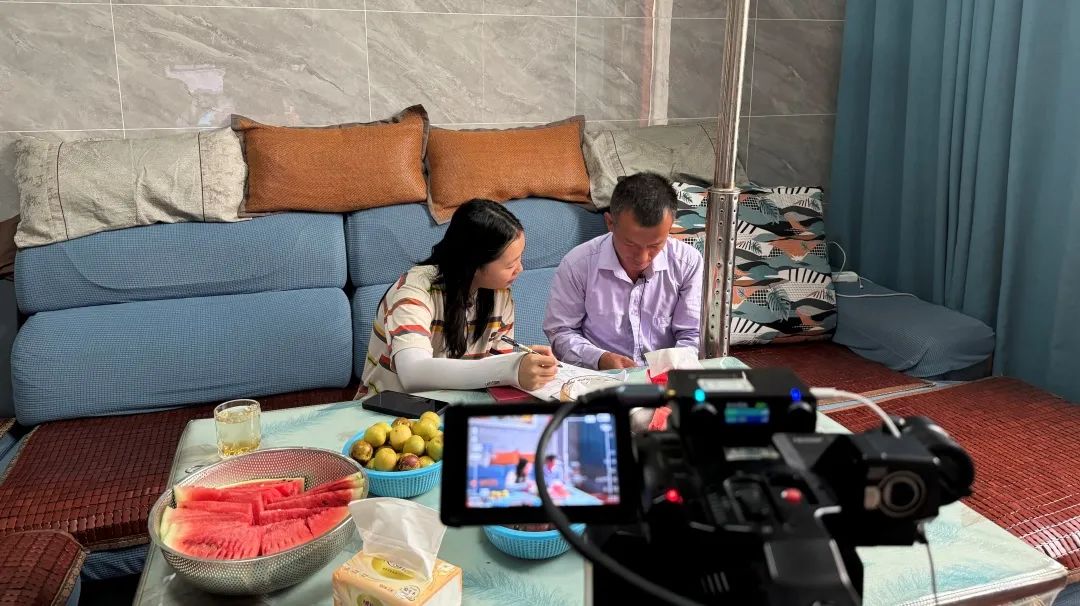 ▲在青海省乐都区,青海民族大学本科生张馨竹访谈高庙镇蒲家墩村脱贫户王国全