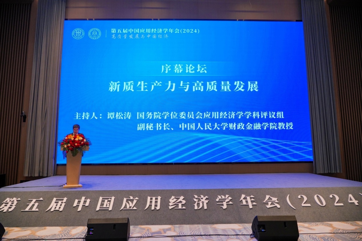 郑新业代表主办方中国人民大学对年会的召开表示祝贺。他表示本次大会以“高质量发展与中国经济”为主题,邀请应用经济学学科带头人交流研讨,协同创新、共谋发展,唱响中国经济光明论正当其时,意义重大。高校作为教育、科技、人才的集中交汇点,应在发展新质生产力中展现更大作为。他希望学界同仁立足中国国情,以服务中国式现代化为出发点,努力构建中国自主的应用经济学知识体系,推进新质生产力体系化和学理化研究,自觉以回答中国应用经济学的中国之问、世界之问、人民之问、时代之问为学术己任,为推进高质量发展、强国建设、民族复兴提供理论支撑和智力支持。