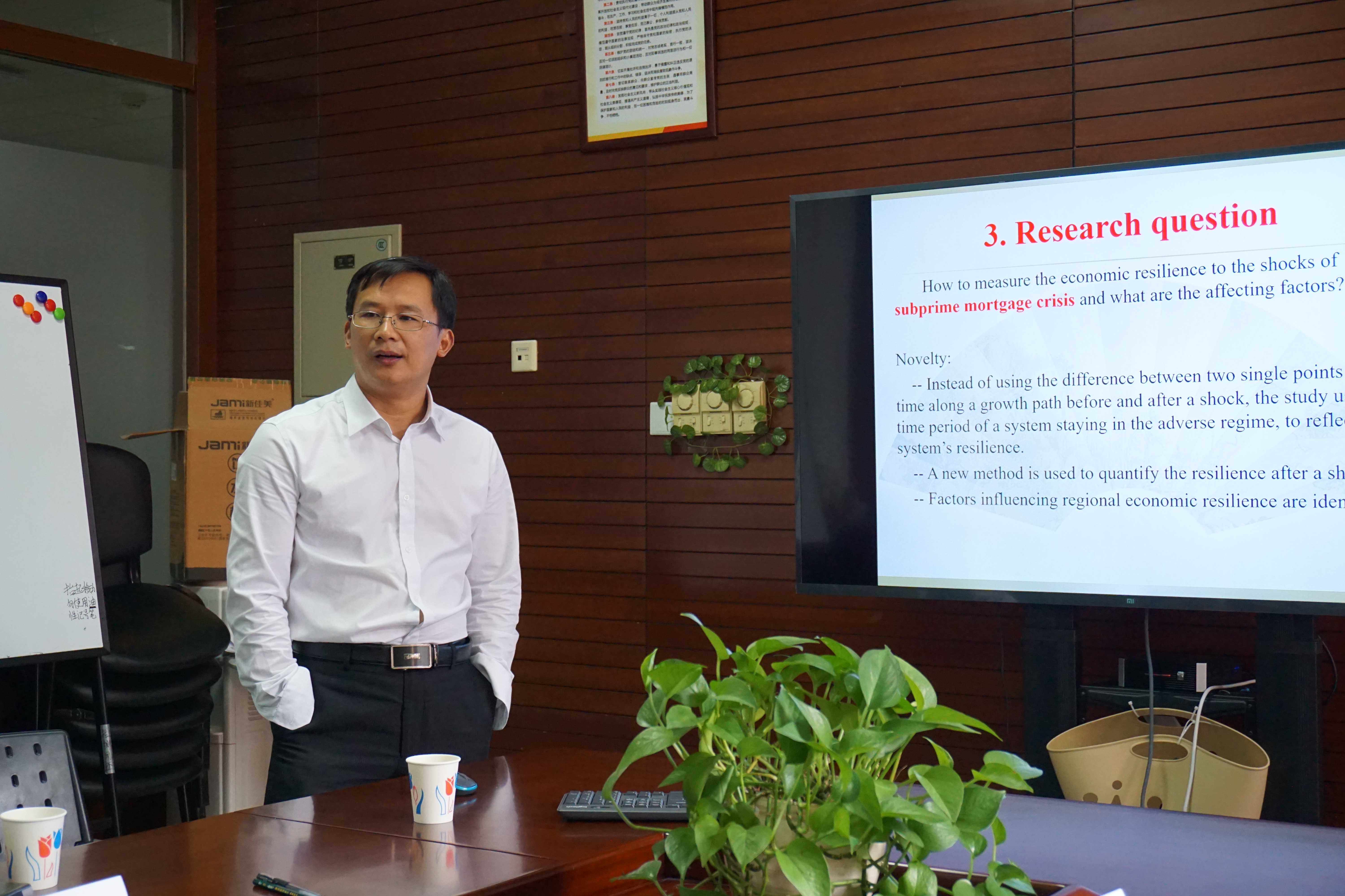 云南大学王赞信教授以“经济系统恢复力及其影响因素研究”为题进行学术报告。在经济学中,经济系统恢复力是指经济系统抵御外部冲击的能力及经济系统受到冲击以后恢复到原来的增长路径的能力。他根据工程恢复力模型,建立了经济系统恢复力模型,运用多稳态向量自回归模型,以2008年次贷危机为外部冲击,以产业多样性,产业集中度(HHI),实物资本存量、贸易开放度,创新能力,金融的自由化水平等为自变量测算了中国各省市的经济系统恢复力。测算结果表明,北京经济系统恢复能力最高,而新疆经济系统恢复能力最低,他提出为了使我国经济向稳态发展,需要建立一个现代经济体系。