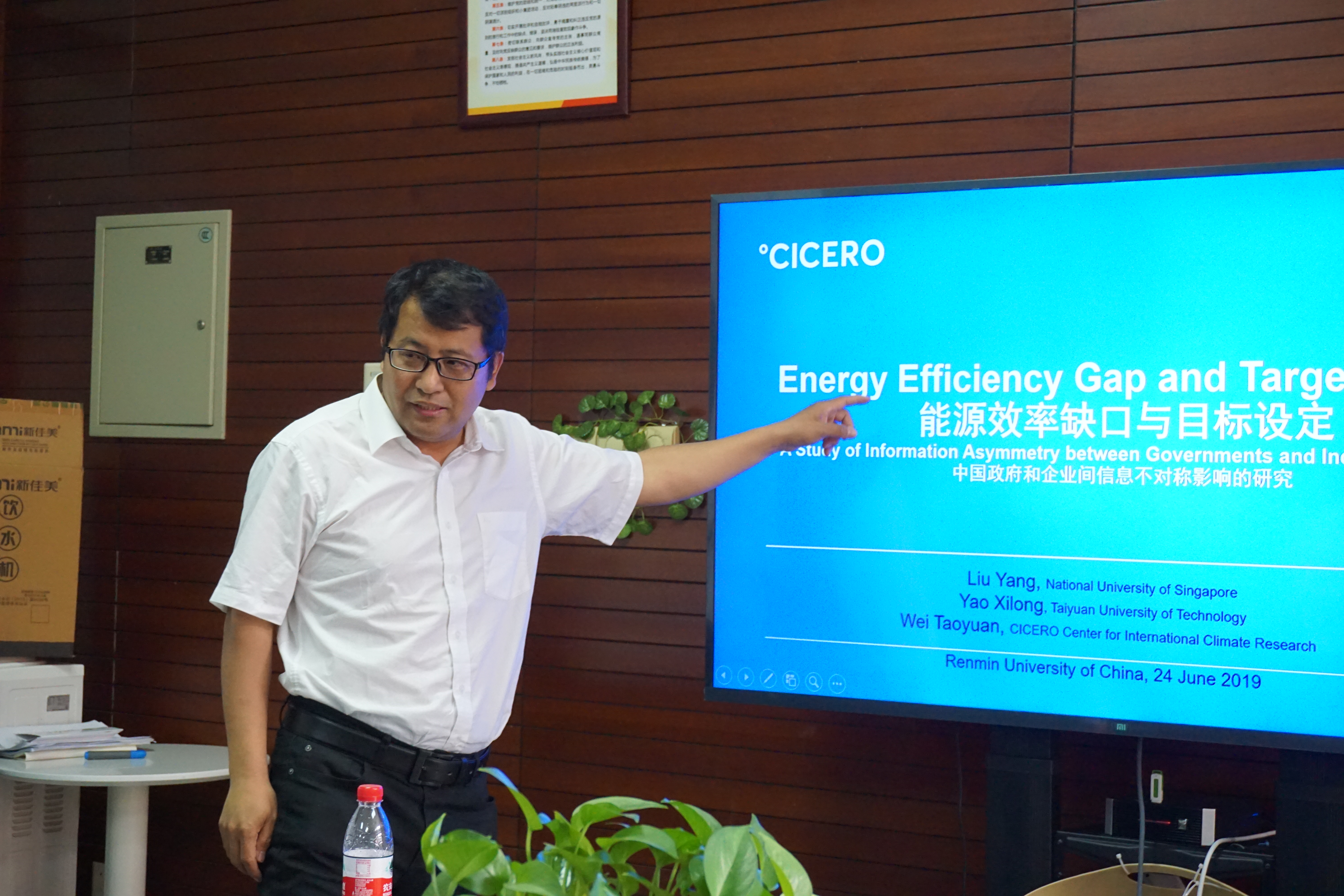 挪威国际气候研究中心魏涛远资深研究员以“Energy Efficiency Gap and Target Setting: A Study of Information Asymmetry between Governments and Industries in China”为题进行学术报告。他采用two-tier stochastic frontier model , 研究了2006-2017期间,中国政府与企业之间的信息不对称对能源效率产生的影响。结果显示,总体而言,企业在对Energy Intensities(EI)的净影响中占主导地位,使得EI上升2.4%。 随着时间的推移,对EI年度净影响中,由企业主导的影响通常要比由政府主导的影响大得多,特别是在经济增长放缓的年份。 在人均GDP中,企业在净影响中占主导地位,但是在最低和最高的群体中的影响相对较弱。