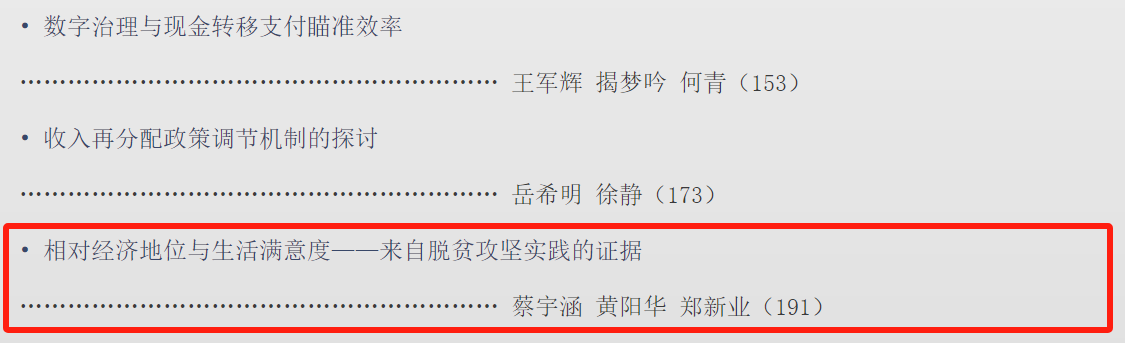 团队利用自主构建的中国贫困人口微观追踪数据库,借助中国脱贫攻坚政策对农村居民相对收入产生的外生冲击,在一个拓展的个体效用函数框架下探讨社会比较心理对人们生活满意度的影响及其机制。研究发现,在控制家庭收入与区域平均收入的情形下,相对经济地位变化对农村居民生活满意度具有显著影响,从而为位置效应提供了稳健的经验证据。团队进一步将相对经济地位变化引入个体效用函数,发现相对位置冲击能够影响农村居民的炫耀性消费、公共物品利用和社会资本积累,构成了位置效应的三种主要机制。最后,该研究提出并验证了“保障机会平等”“提升公共资源可得性”两种方式,兼具直接提升生活满意度与间接缓解位置效应的双重作用,应引起更多的研究关注和政策重视。