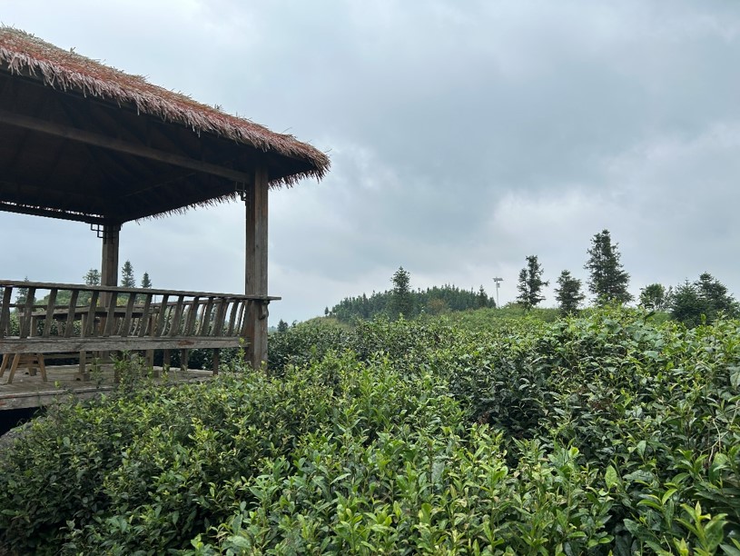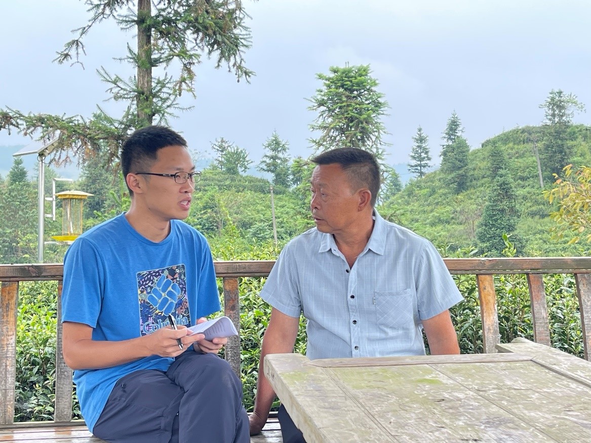 在茶山上的小亭里,中国人民大学硕士研究生许嘉晖对木桑村支书唐登立进行了访谈。据村支书介绍,脱贫之初,木桑村共有13个村民小组、470多户、4500多人,通过易地扶贫搬迁安置了149户。贫困户108户,其中15户是监测户。在脱贫攻坚过程中,木桑村大力改善基础设施建设,实现组组户户通硬化路,人居环境得到很大程度提升。在脱贫攻坚期间,木桑村大力发展茶产业,依托东西部协作,主要从浙江和福建购买茶苗,盘江红公司协助种植,提供专业的技术服务,本地村民只需管护。通过东西部协作和龙头企业入驻,木桑村茶产业的产业链各环节都已经相对完善。以8亩茶叶为例,若请人来摘,每年也能获取五六万纯收入,增收效应显著。木桑村的茶叶一大特点是收茶期早于浙江一带,春茶的黄金芽在腊月底到正月的一个多月内采摘。在不采夏秋茶的情况下,清明节之后开始修枝。尽管茶叶价格浮动大,但每天都能有两三百左右的收入。此外,木桑村的茶叶采用人工除草方式,不用除草剂;同时种植矮杆作物,施农家肥,提升种植效益。