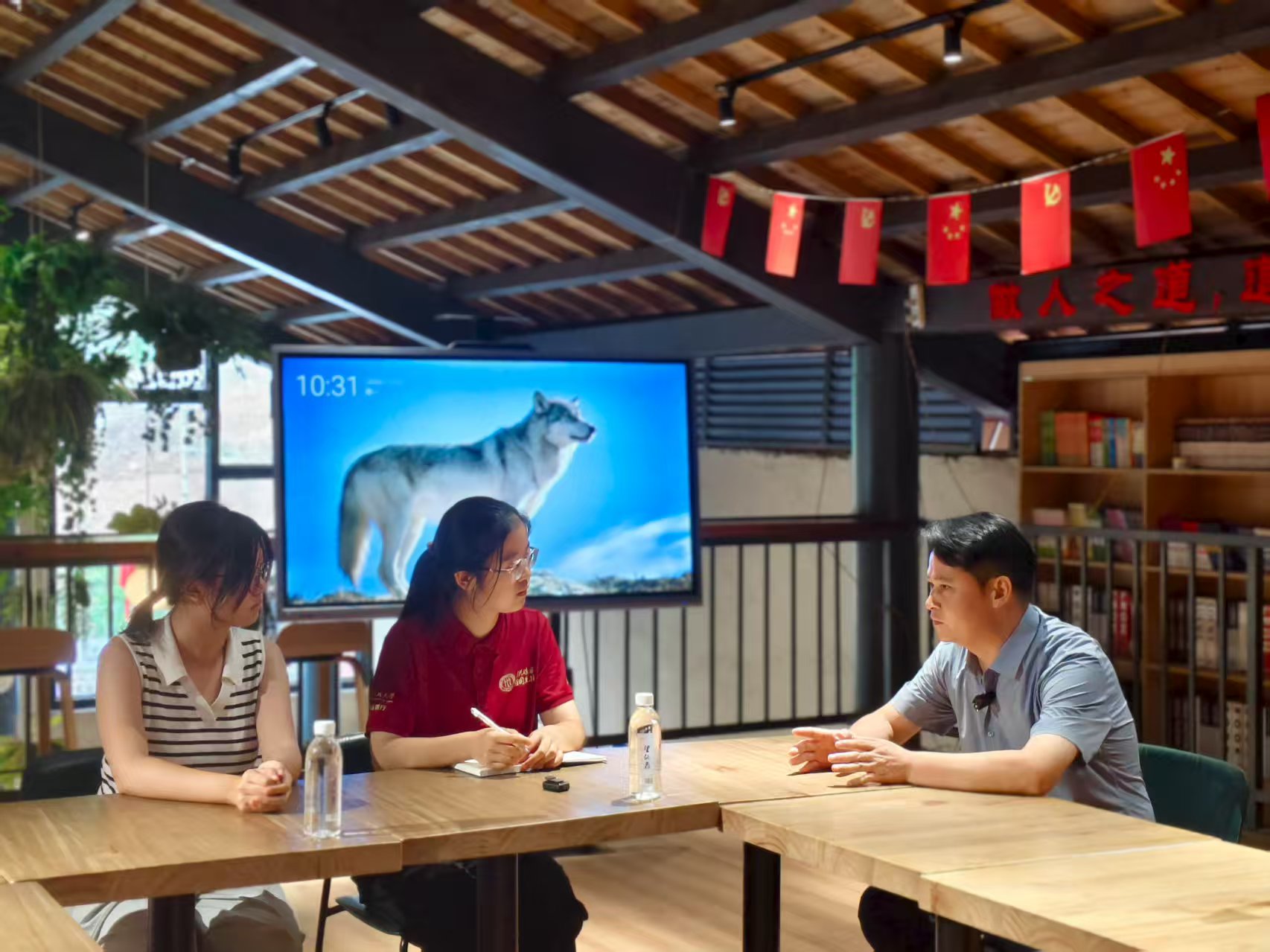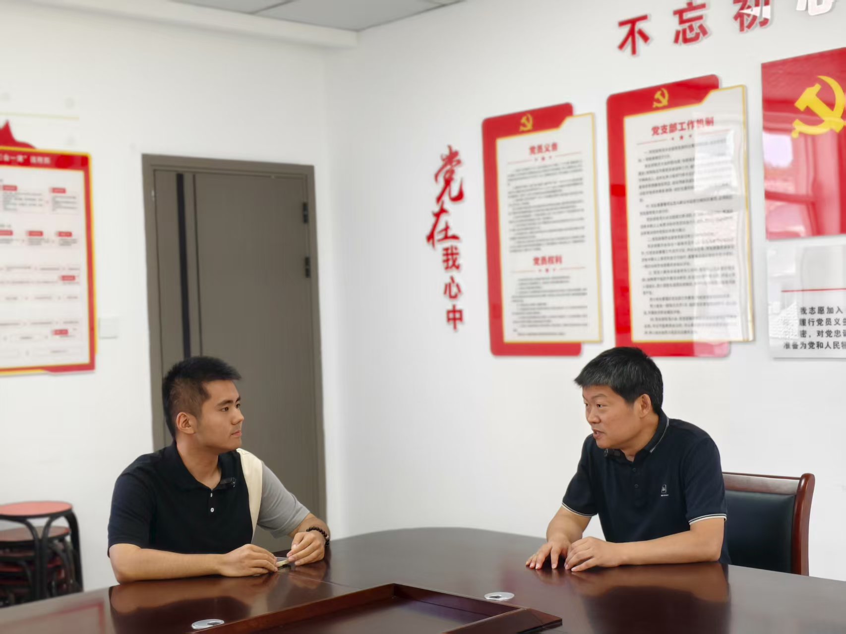 ▲中国人民大学新闻学院硕士生薛思远访谈清水乡党委副书记、乡长胡烈飞