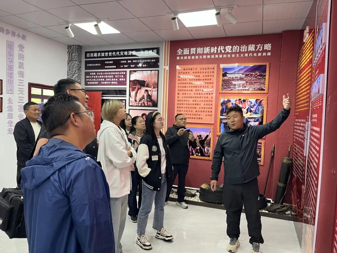 ▲访谈团实地调研加查县雅江实业有限责任公司的核桃油产品