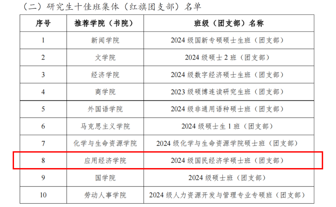 经世笃行育“三有”,挺膺担当砺新人。2024级国民经济学硕士班(团支部)的24名同学,在班主任带领下,积极进取。强化理论武装,引领青年锤炼品格觉悟,创新探索党团班一体化建设模式,做实做细五学联动,筑牢信仰之基;聚焦主责主业,助力青年练就专业本领,营造勤学精研、互促互进、求真务实的学风班风,在学术科研、国际交流、建言资政中勇担重任;深耕实践育人,砥砺青年培育健康身心,积极参与“832工程”等调研实践项目,足迹遍布全国75个县级行政单位,志愿总时数超2300小时,做到用脚步丈量祖国大地。他们是知行合一的践行者,更是强国新征程中昂扬奋进的生力军。