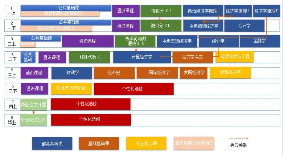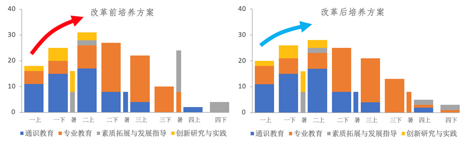 纵向上根据学生四年学习的“爬坡曲线”,合理分配各学期的学习难度,平滑各学年的学分分配;将部分中级课程前移,为本科科研创造条件。