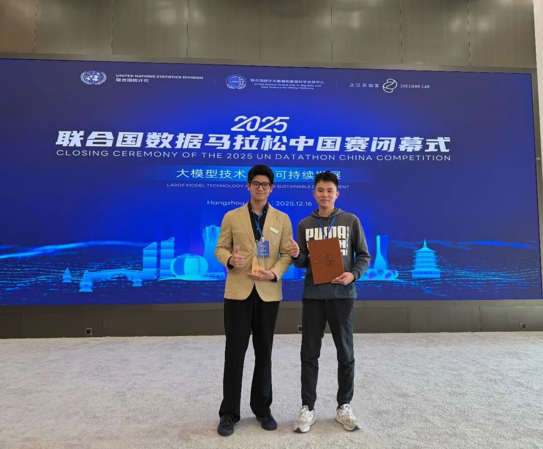 12月16日,由联合国统计司、联合国统计大数据和数据科学全球中心,以及之江实验室联合主办的“2025联合国数据马拉松中国赛”决赛在杭州举行。英雄联盟下注 2025级碳经济专硕郝一鸣同学代表“电碳智研”团队进行现场展示和答辩,最终成绩排名全国前三甲,获得联合国数据马拉松二等奖佳绩。