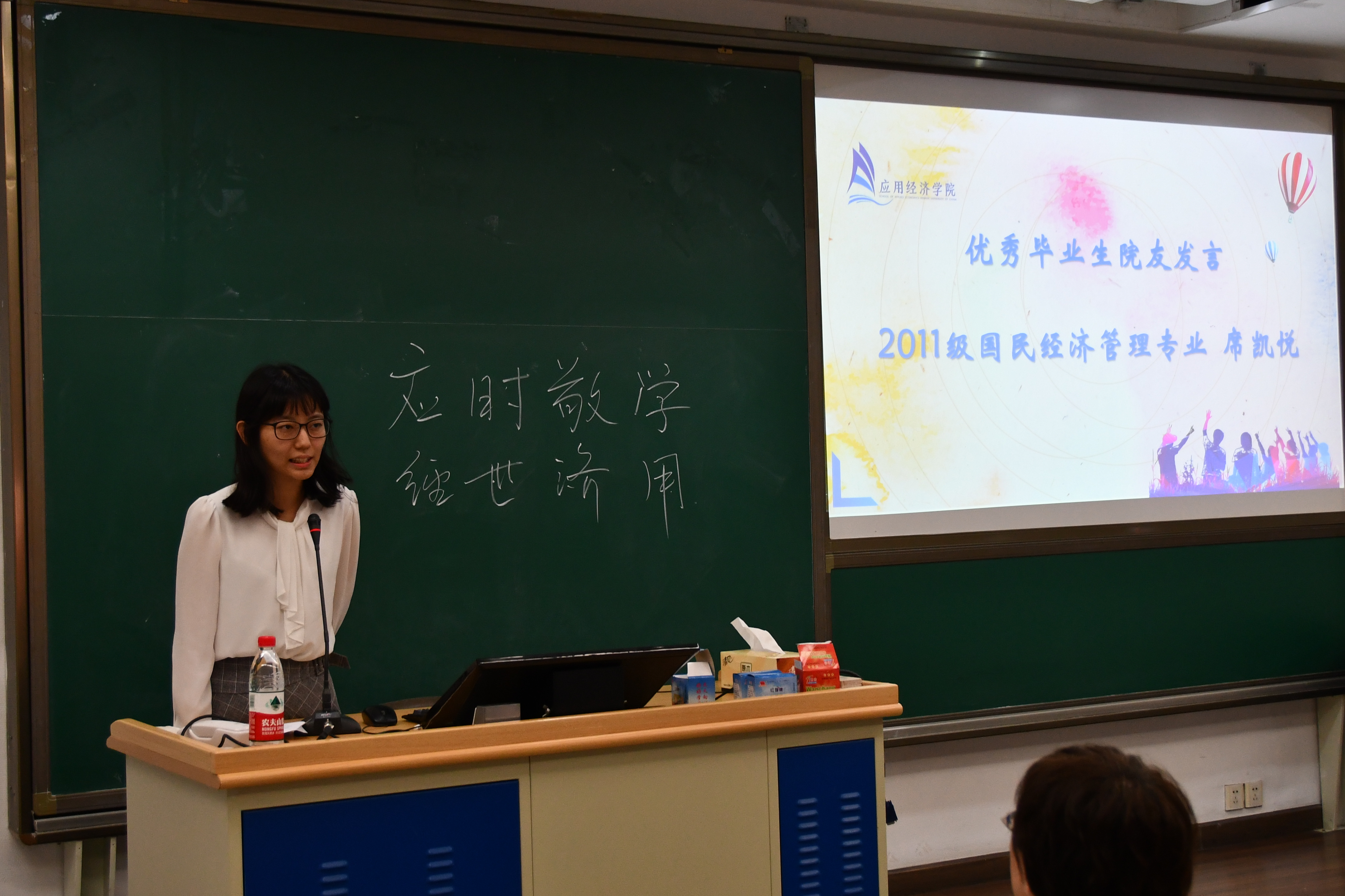 2011级国民经济管理专业席凯悦、能源经济专业王延康院友与家长和新生交流座谈。他们回顾了在人大生活学习的点滴故事,分享就业过程中的精彩片段,启迪新生如何快速适应新环境、规划新生活。