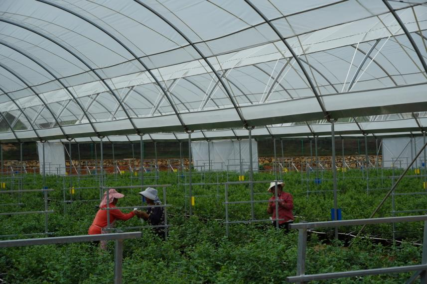 8月12日下午,七彩红河队到达午街铺镇普泽村委会皓澜蓝莓基地,午街铺镇镇长王俊玲为访谈团成员介绍蓝莓产业设计思路。午街铺镇坚持以农业产业特色化,特色产业规模化为主线,通过引龙头、兴产业、育品牌,为乡村振兴提速赋能。得益于光照充足、昼夜温差大、低纬度高原的区位优势特点,泸西县具有适宜发展高原特色蓝莓的广阔空间和市场前景。午街铺镇抓牢基础设施建设,引进云南皓澜农业发展有限公司。该公司投资4500万元在普泽村建设250亩高品质蓝莓基地以及分拣冷链保鲜设施,预计年产值3200余万元。午街铺镇积极探索农产品种植多样化,在带动增收的同时,分散产业单一的市场风险。