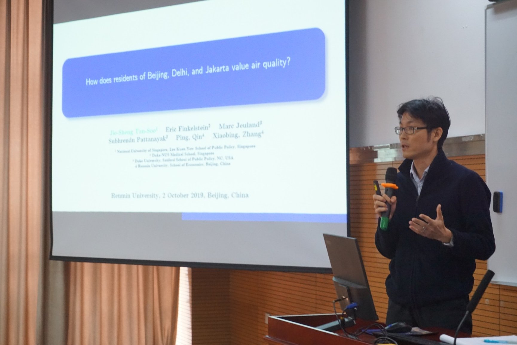 “环境与健康”专题由中国人民大学农业与农村发展学院仇焕广教授主持。南京大学环境学院张炳教授、新加坡国立大学助理教授Jie-Sheng Tan-Soo、印度统计研究所德里中心Gaurav Dhamija博士分别进行报告。报告人就信息透明度对环境质量的影响,空气质量价值评估、婴儿时期营养对长期健康的影响等问题进行探讨。