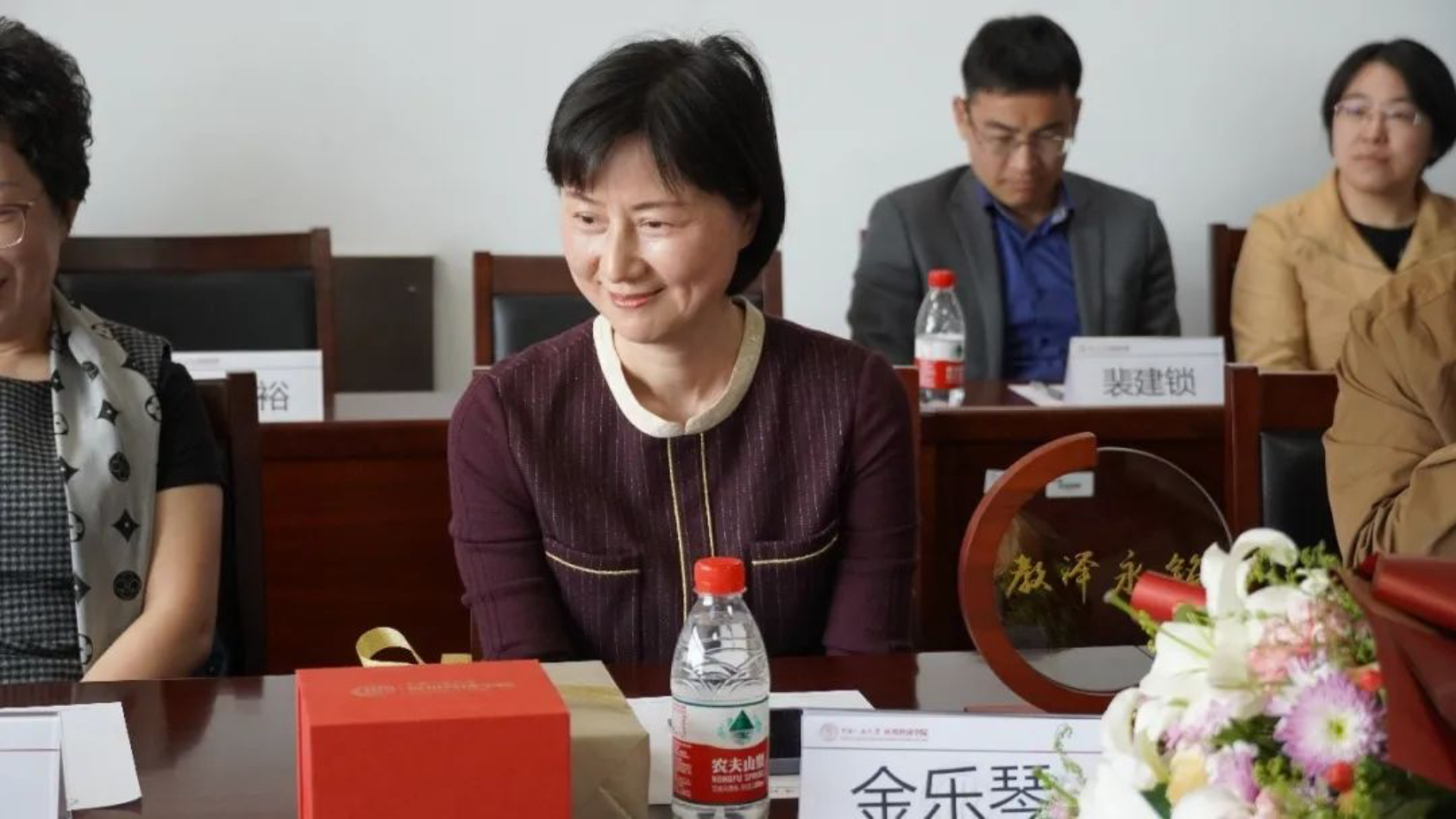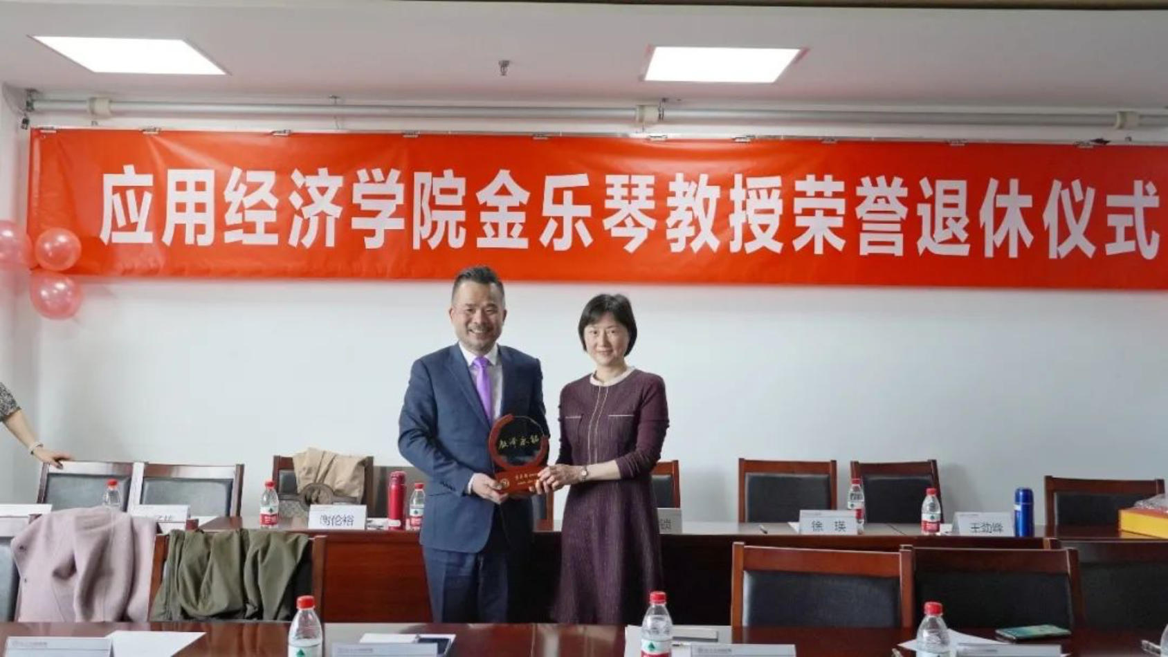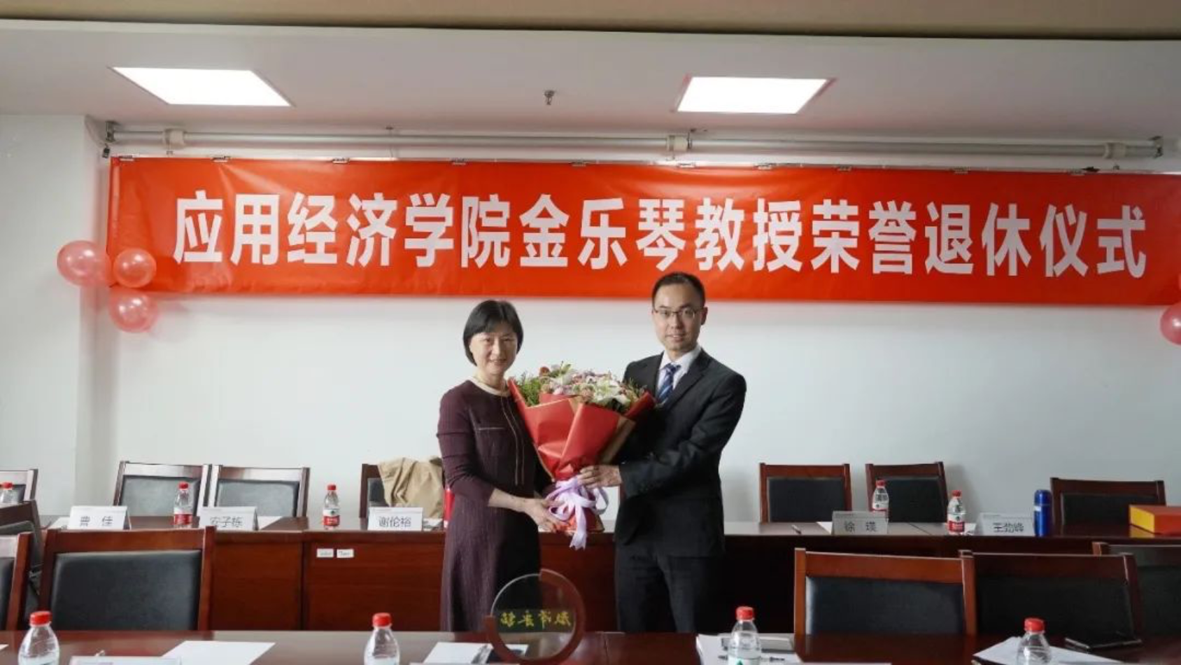 郑新业和宋东霞代表学院分别为金乐琴颁发荣退牌匾和纪念品,青年教师曹佳献花。