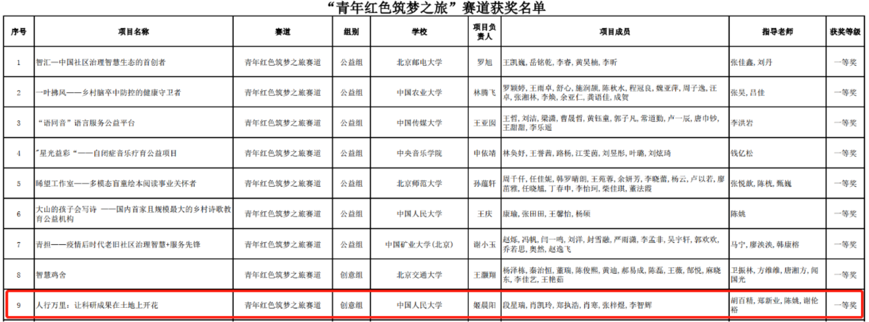 北京赛区“青年红色逐梦之旅”赛道获奖名单(部分)
