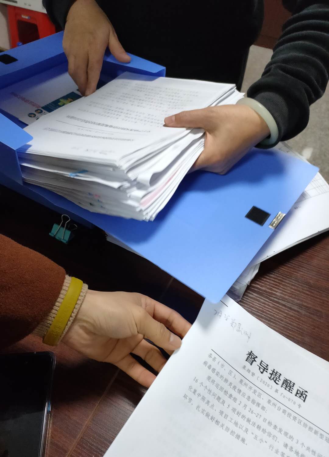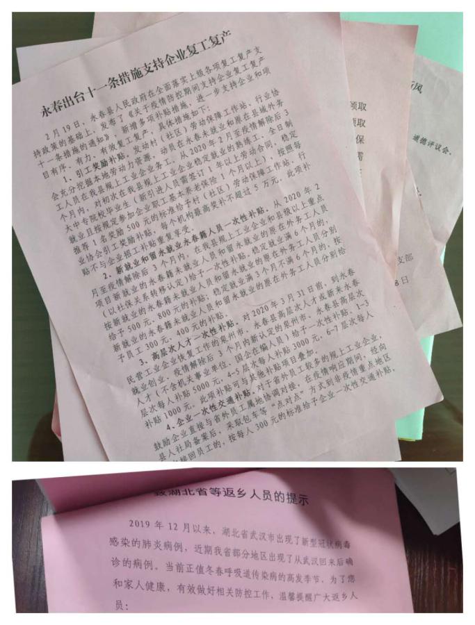 只在线上工作是不行的,印刷成册的防护手册、交通限制的具体通知、支持复工复产的措施内容……这些都需要挨家挨户分发到户主的手上,确保人人消息通达,适时及时响应抗疫需求。